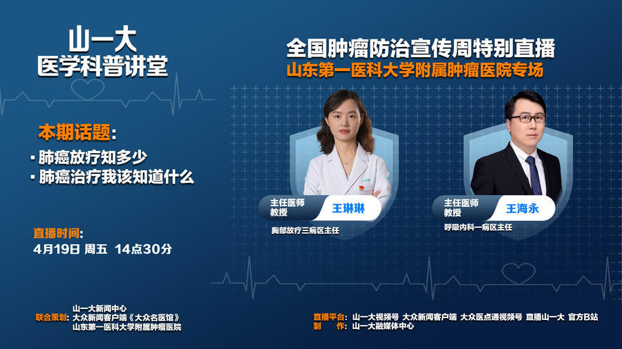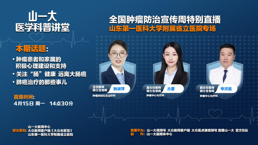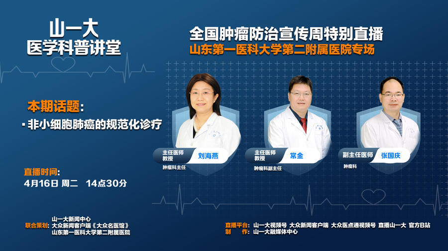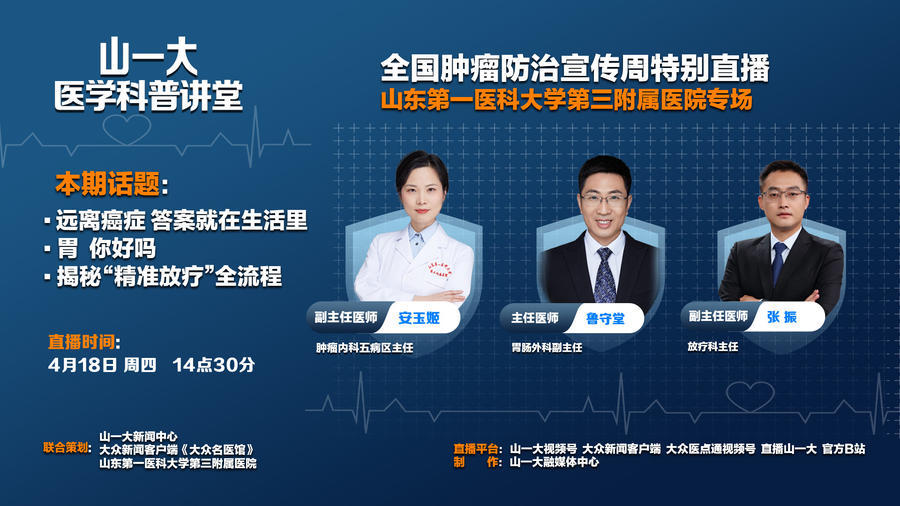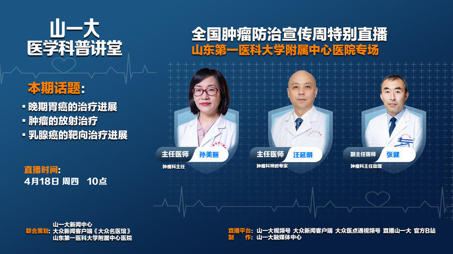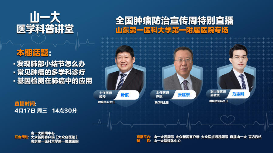 4月15日-4月21日是第30届全国肿瘤防治宣传周,今年的主题为“综合施策 科学防癌”。为普及肿瘤知识,大众新闻客户端《大众名医馆》联合山东第一医科大学(山东省医学科学院)新闻中心,特别策划《大众名医馆》全国肿瘤防治宣传周系列直播——《山一大医学科普讲堂》。邀请来自6家支持单位的17位专家,从4月15日到4月19日,带来连续5天的医学科普直播,为大家科普肿瘤防治相关知识。