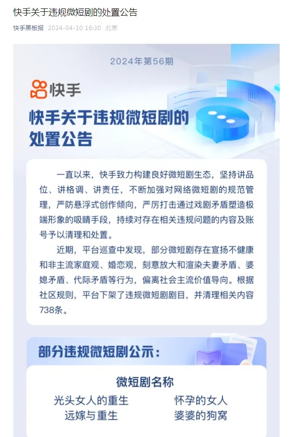 近期抖音平台发现部分微短剧宣扬不健康和非主流的家庭观、婚恋观,刻意放大和渲染夫妻、婆媳矛盾等内容,此次被下架的6部微短剧分别为《老公是个妈宝男》《最后的底线》《千金小姐反击》《怀孕的女人》《我的底线》《妈妈的生日》。快手发布公告称:“近期,平台巡查中发现,部分微短剧存在宣扬不健康和非主流家庭观、婚恋观,刻意放大和渲染夫妻矛盾、婆媳矛盾、代际矛盾等行为,偏离社会主流价值导向。根据社区规则,平台下架了违规微短剧剧目,并清理相关内容738条。”部分违规微短剧包括《光头女人的重生》《怀孕的女人》《远嫁与重生》《婆婆的狗窝》。据统计,2023年,通过国家广电总局系统登记并进行上线备案的微短剧一共557部,12630集。去年全年共上线重点网络微短剧384部,较2022年的172部增加了1倍多。微短剧行业蓬勃发展,已经成为当前影视行业最具发展活力和潜力的新兴网络文艺形态。