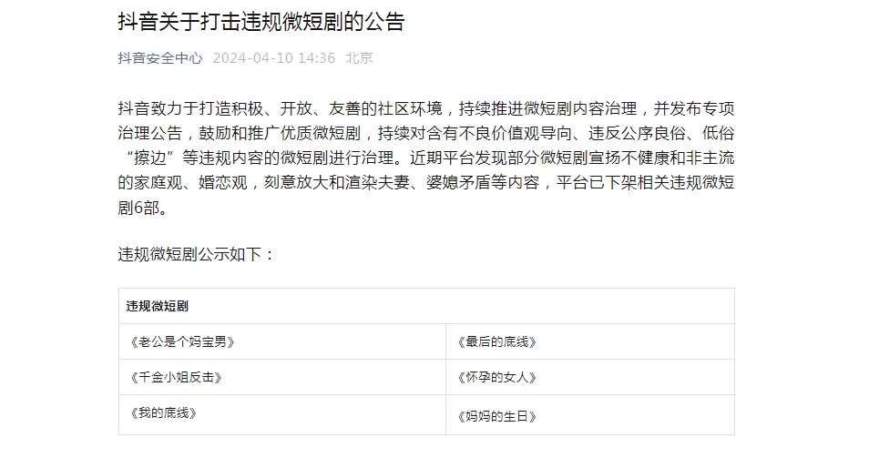 4月10日,抖音安全中心公告表示,抖音致力于打造积极、开放、友善的社区环境,持续推进微短剧内容治理,并发布专项治理公告,鼓励和推广优质微短剧,持续对含有不良价值观导向、违反公序良俗、低俗“擦边”等违规内容的微短剧进行治理。