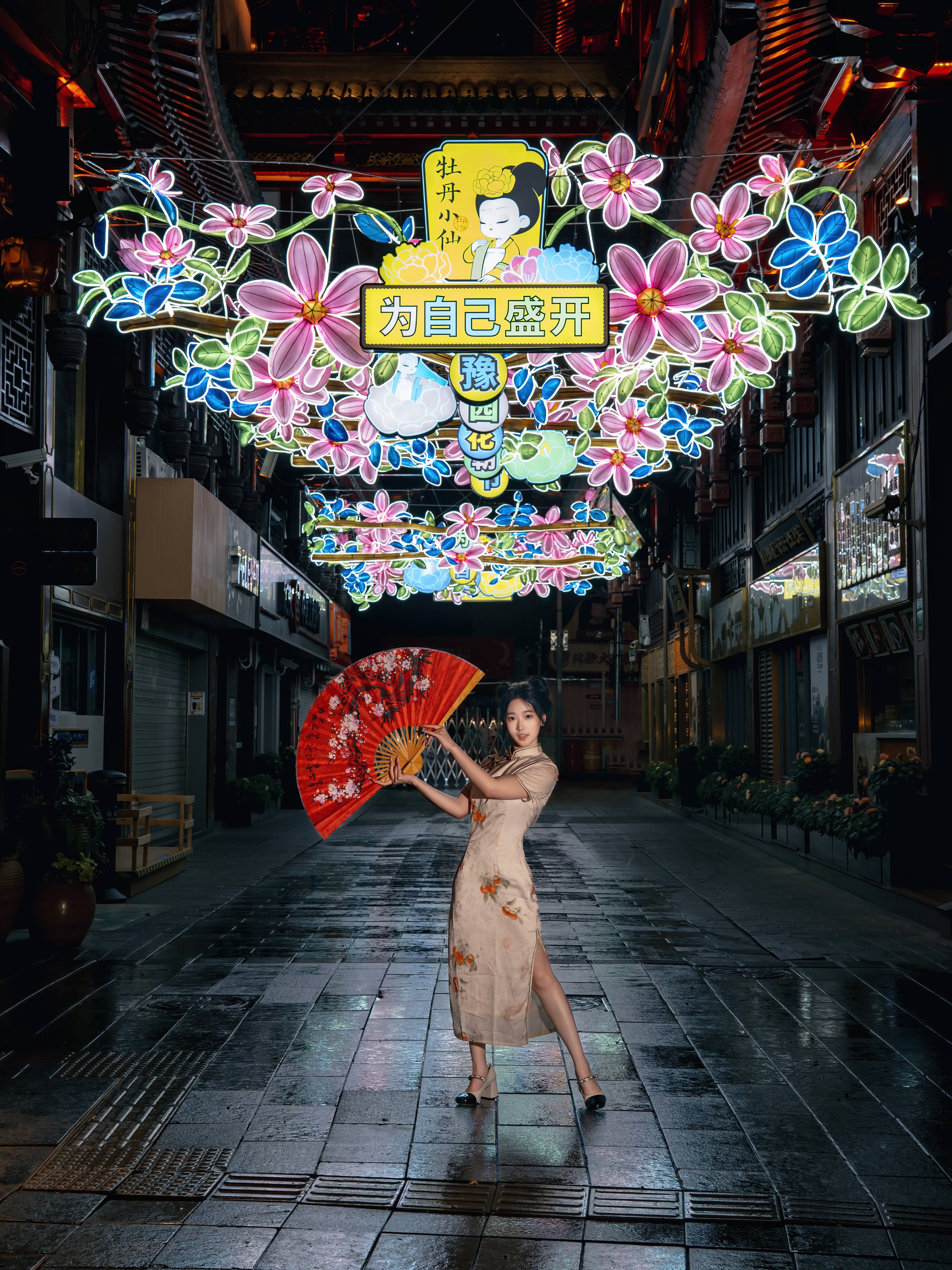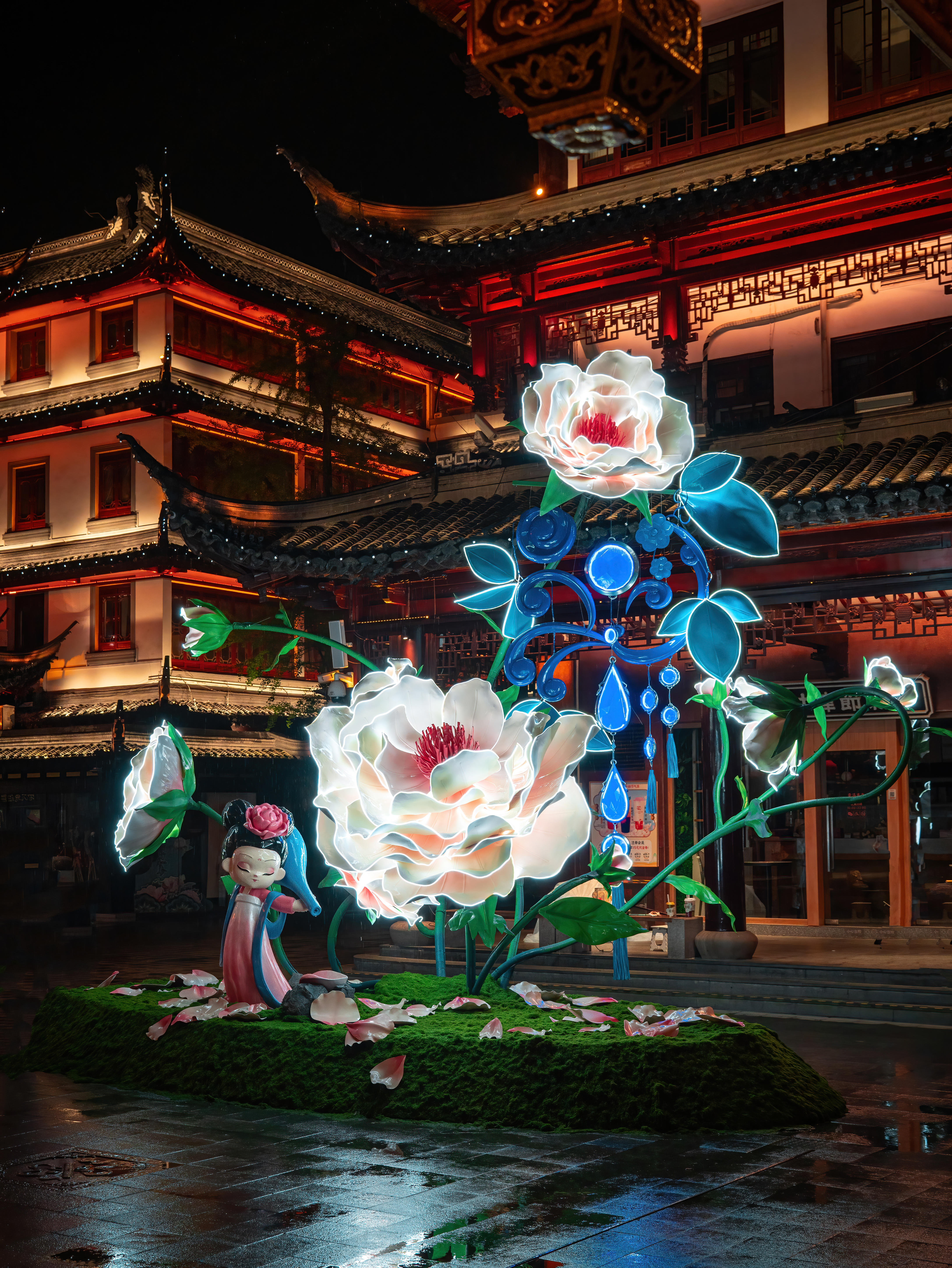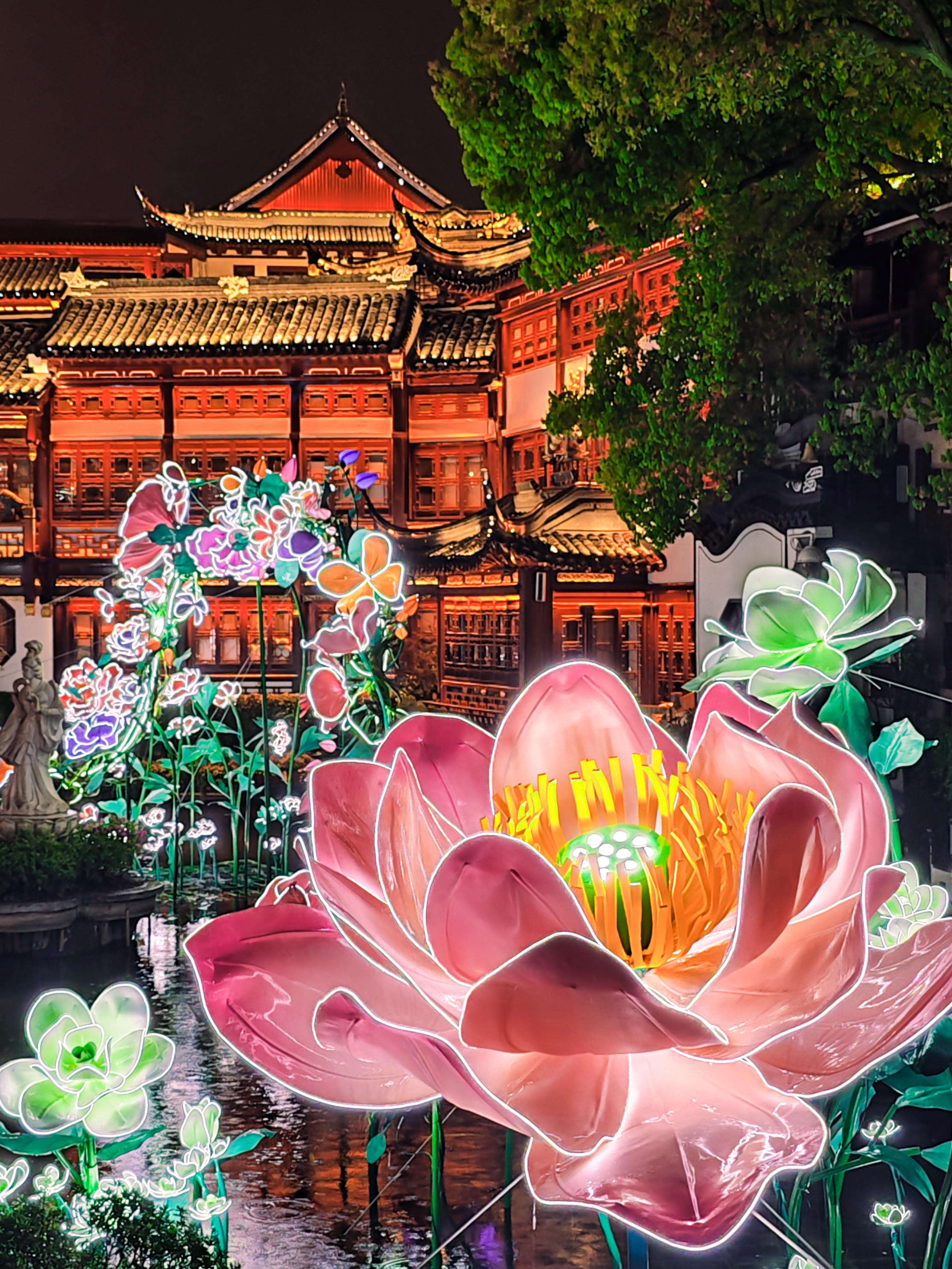 九曲桥湖心亭旁,“福豫花海”寻美。将宋代墨笔画《百花图卷》中百花绽放之姿,与九曲桥十二节令花图腾相结合,百年九曲桥被打造成花团锦簇、姹紫嫣红的百花福地。240年的湖心亭畔开出一朵巨型牡丹,花瓣纷飞环绕护蕊,花心吐蕊“牡丹小仙”,生机勃勃。当夜幕降临,九曲湖面波光粼粼,灯影与花影交织,百年的九曲桥湖心亭,上古的花神牡丹,共绘如梦似幻奇景。