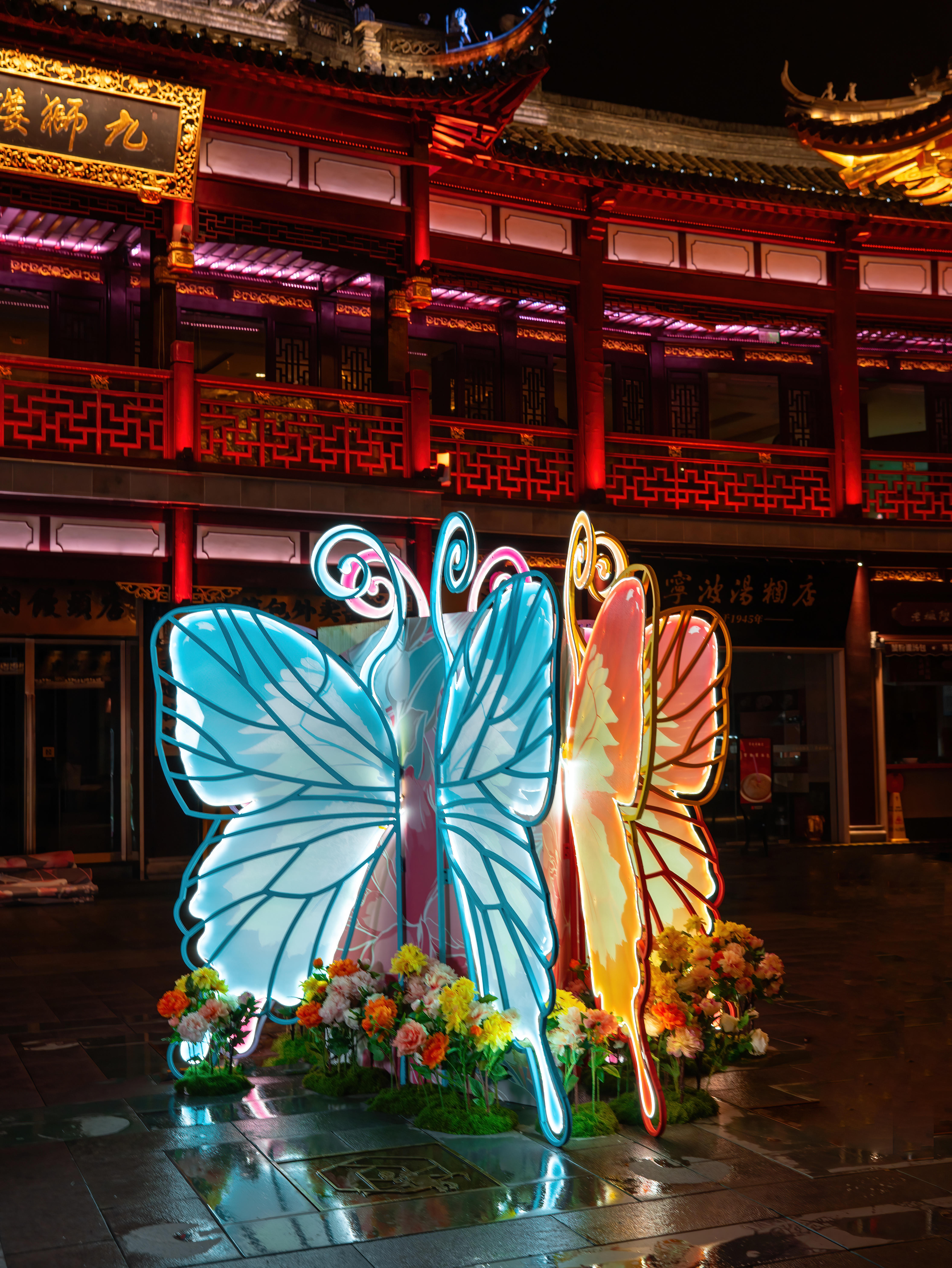 金广场景容楼前,“踏春寻蝶”寻善。素以祈福之地著称的黄金广场,被三面巨型蝴蝶花语墙装点,步入式祈福花墙点缀各色花朵,游人可在蝴蝶祈福卡上写下心愿与祝福。蝴蝶花语墙旁,飞洒的花瓣,散落成一条“富贵花开”祈福之路,一直蜿蜒至九狮楼前。拾阶而上,经过二楼连廊,进入“松·艺术空间”的优雅芬芳之境,可寻觅到“空中豫园”“最美盛放露台”,赏400年江南园景,品新中式茶点。