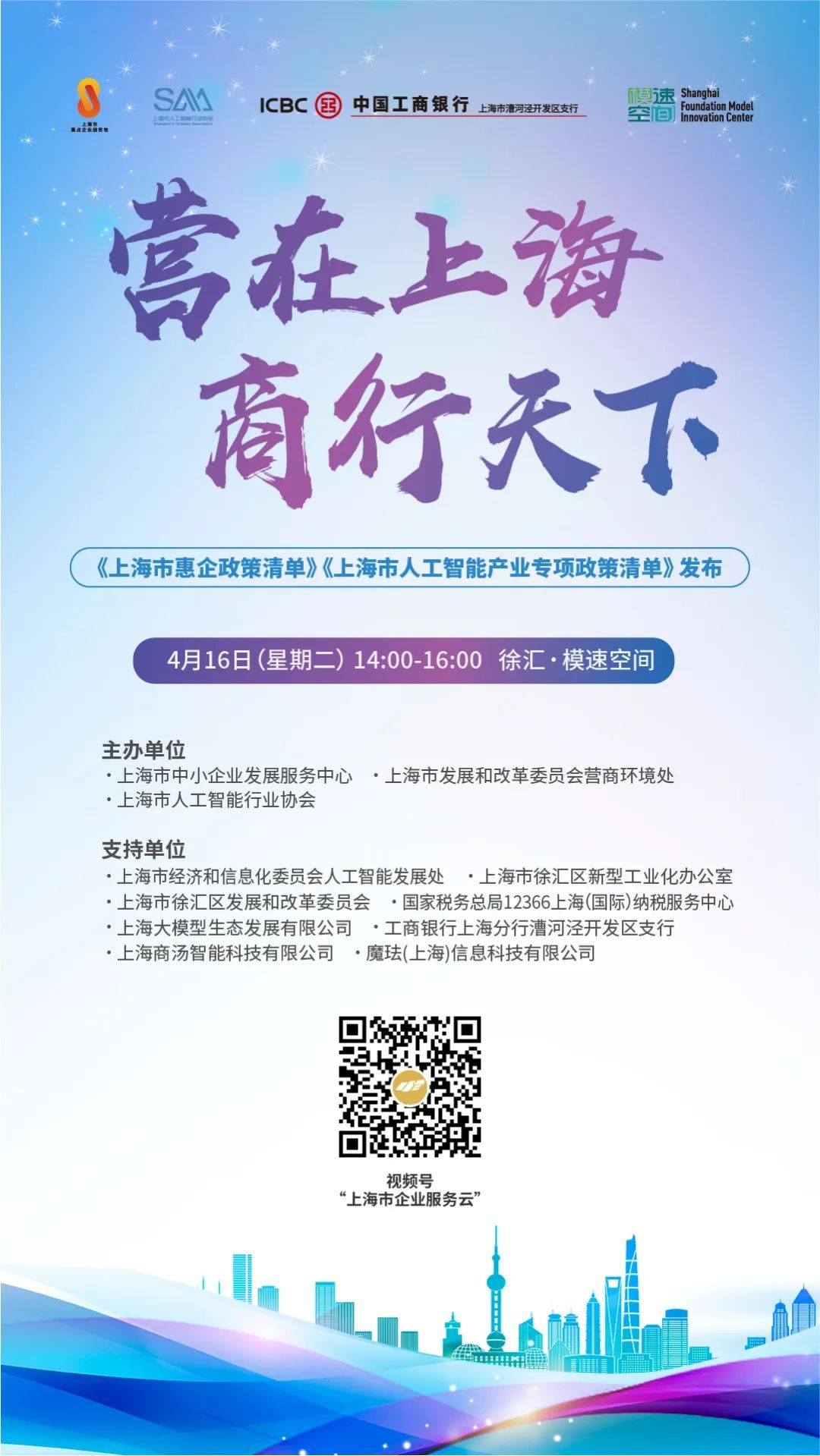 为了落实好营商环境7.0方案及重点企业服务包工作,上海市中小企业发展服务中心联合上海市发展和改革委员会营商环境处举办“营在上海•商行天下”系列活动,聚焦3+6重点产业体系,发布重点产业专项政策清单,解读相关的热点政策。首场活动聚焦人工智能产业,并发布《上海市惠企政策清单》《上海市人工智能产业专项政策清单》。