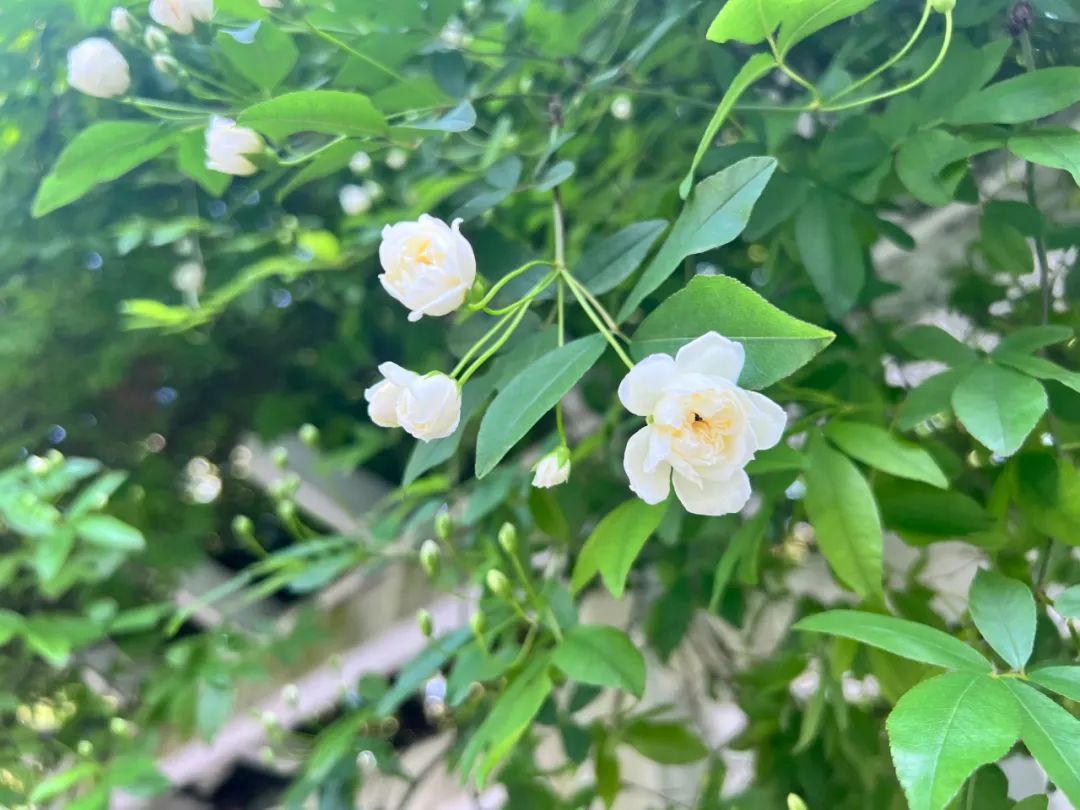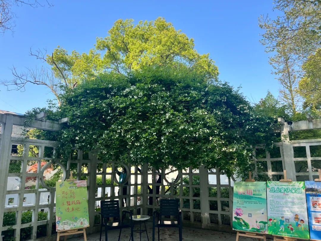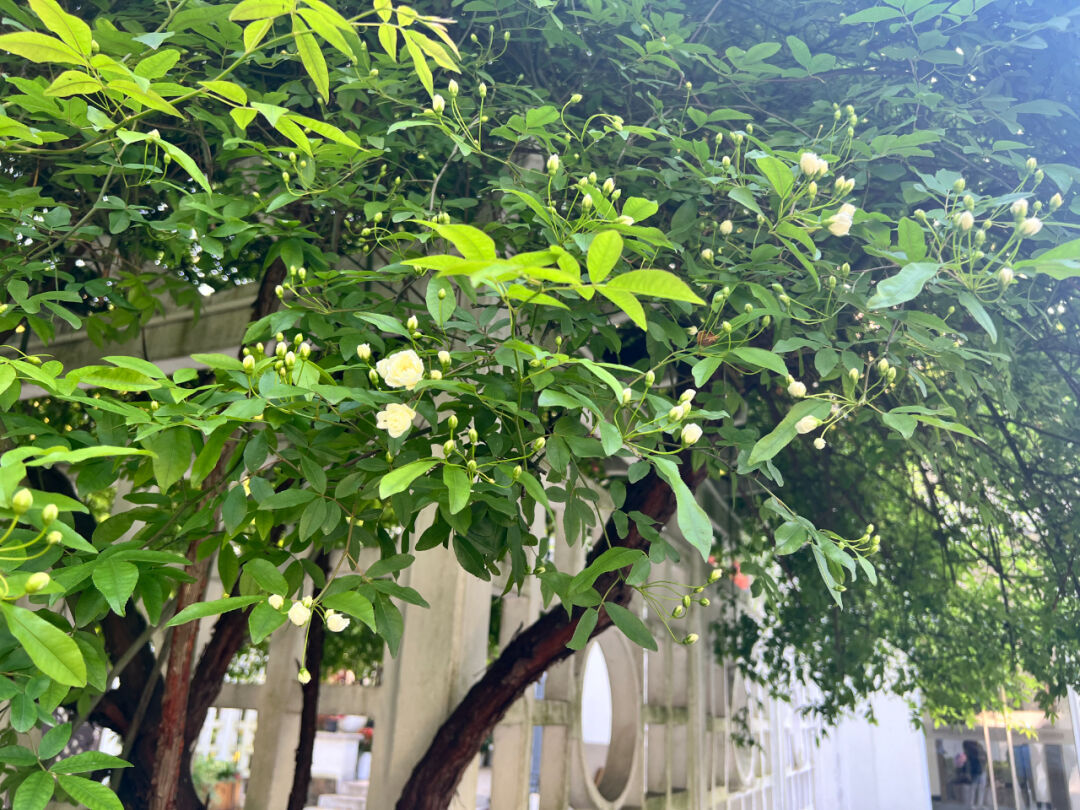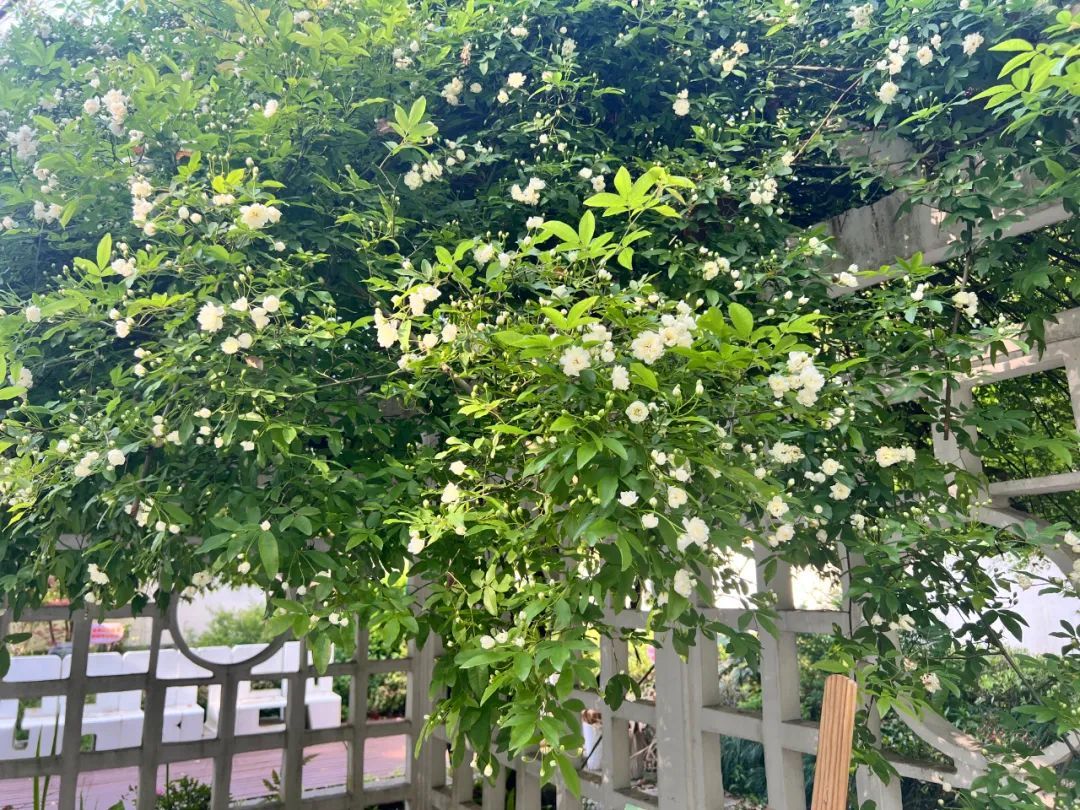 如今,申城进入四月天,服务站门口的一株木香迎来盛花期。木香花是蔷薇科蔷薇属植物。修长的枝干附着叶子伸展着。花虽不大,却肆意生长,引得游人闻香而来。
