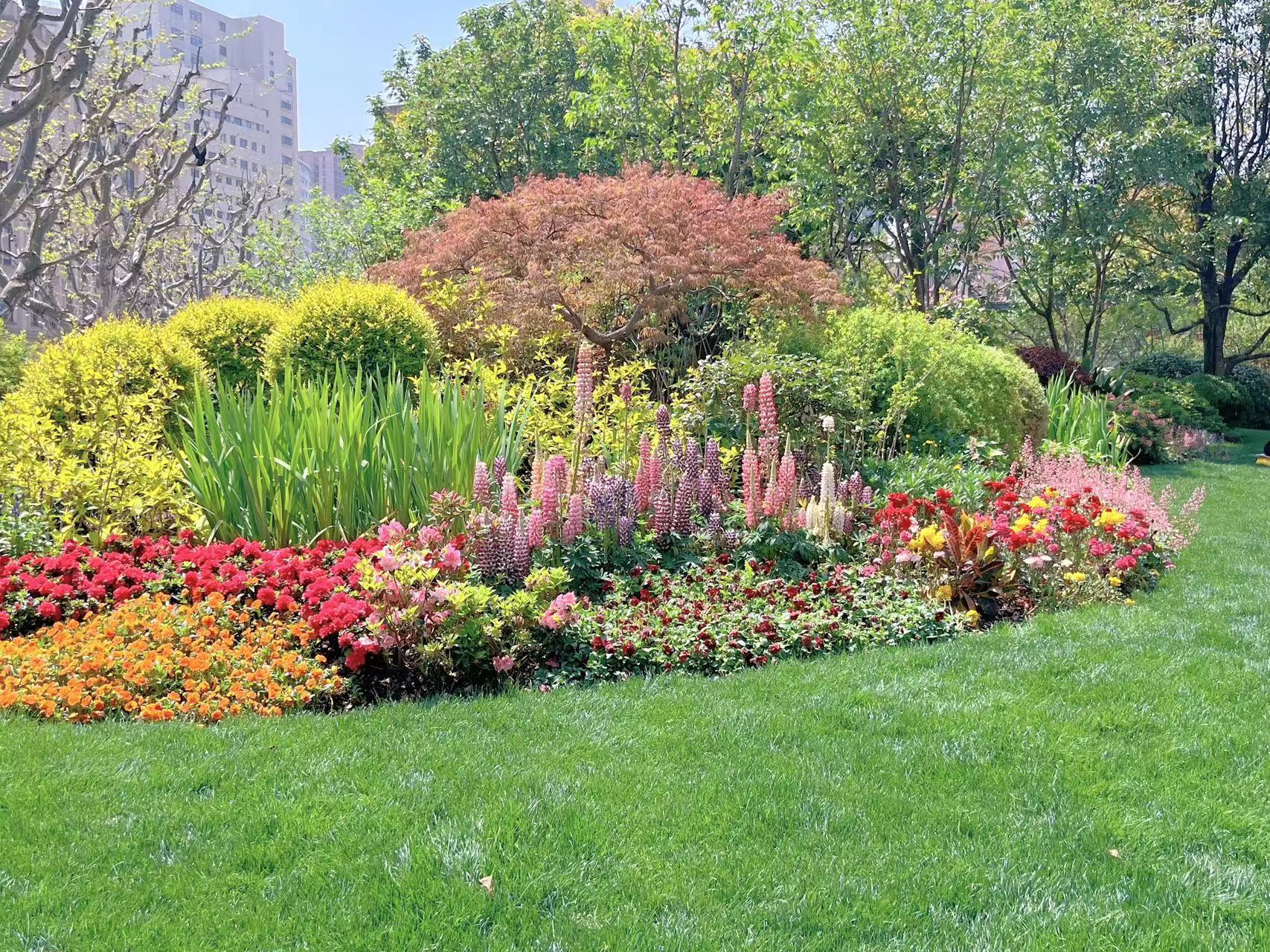 改造后的永源浜绿地处处可见区绿化部门在提升城市景观方面的匠心。如这块绿地最外侧的花境也是经过了精心的设计和搭配,看似小小一处,却使用了羽扇豆、西洋鹃、三角梅、毛地黄、飞燕草、天竺葵、比格海棠等十余种花材搭配,色彩多样又和谐,仿佛一幅“莫奈花园”油画,牢牢吸引了来往行人的眼球。