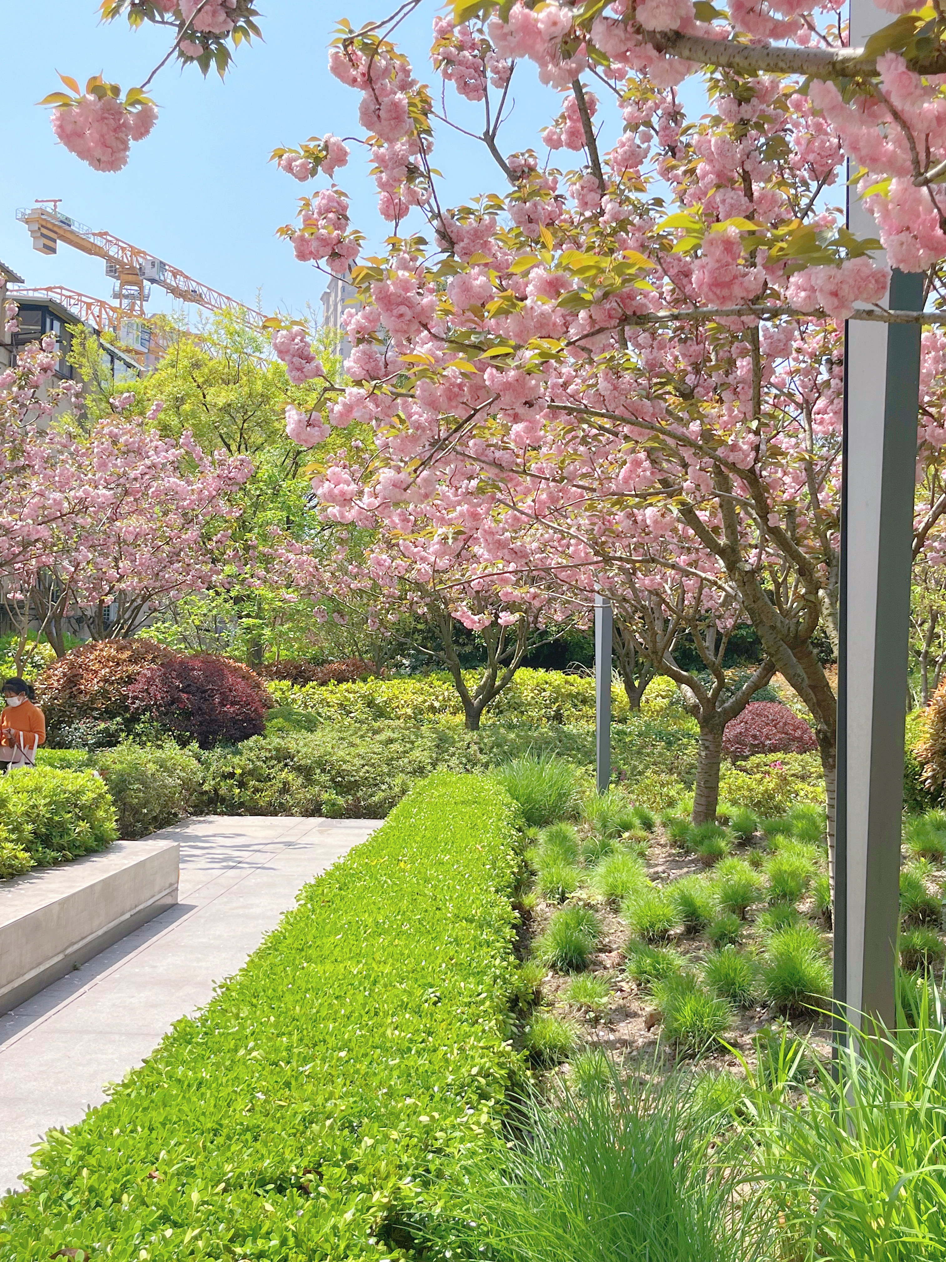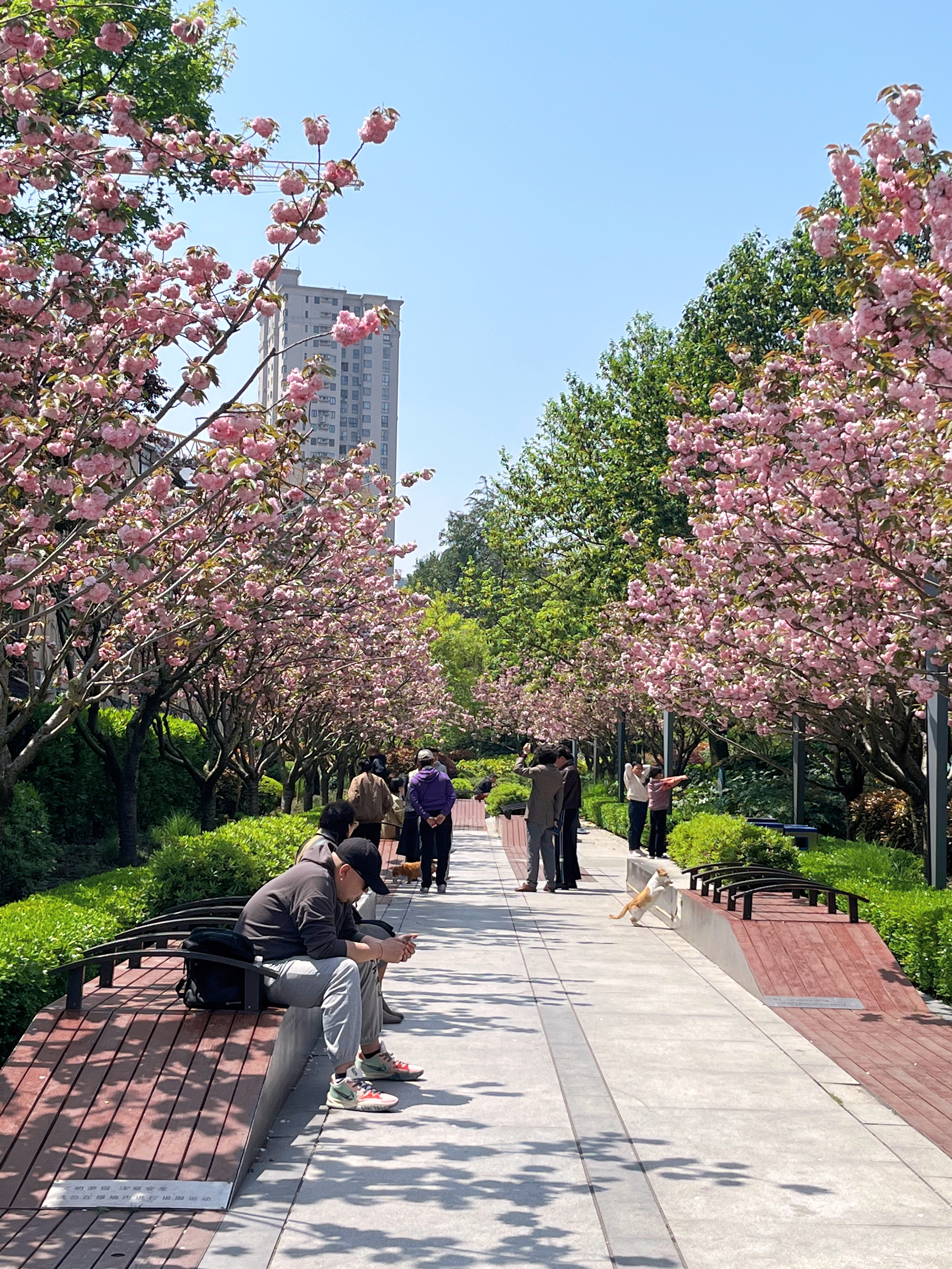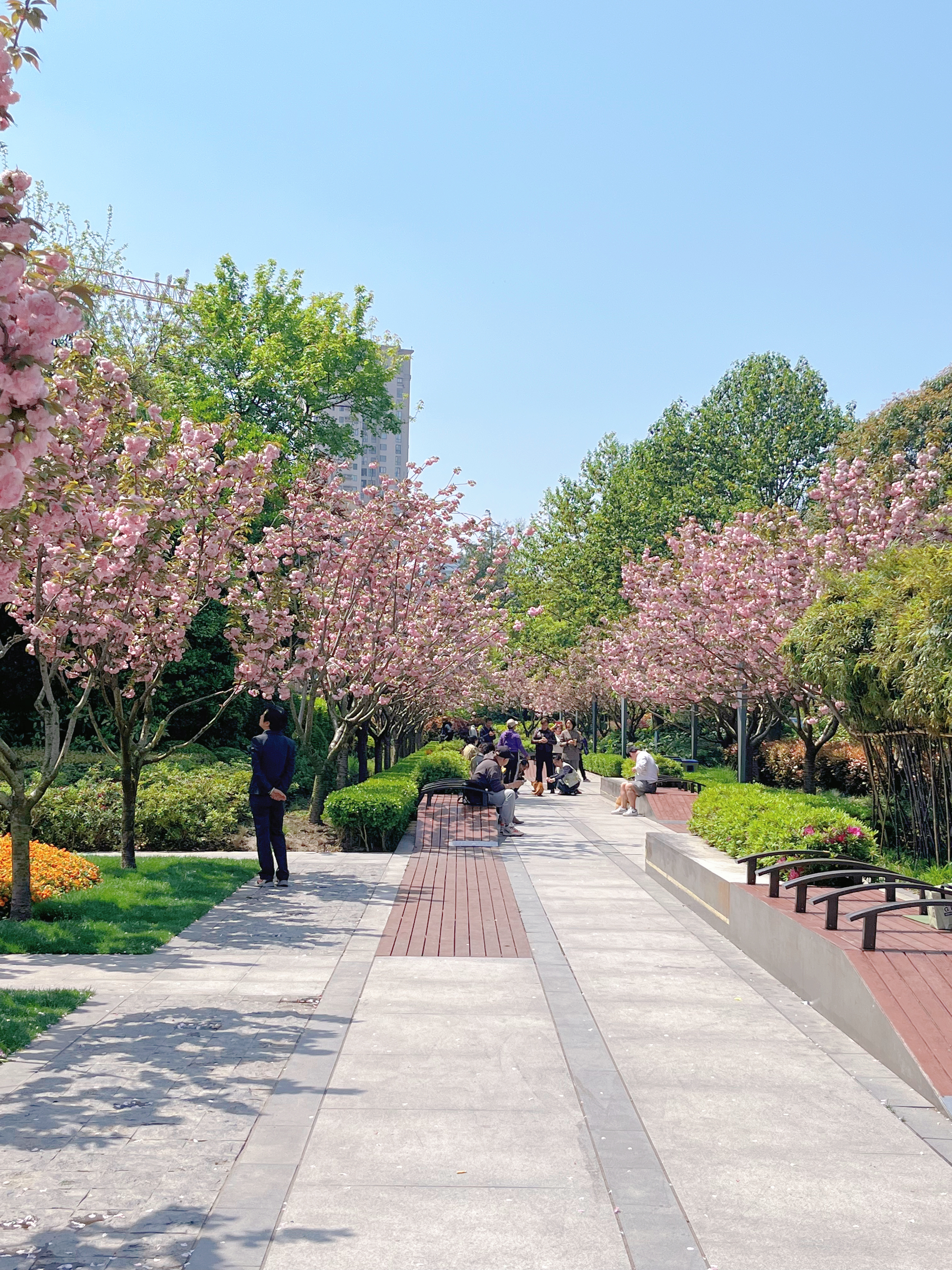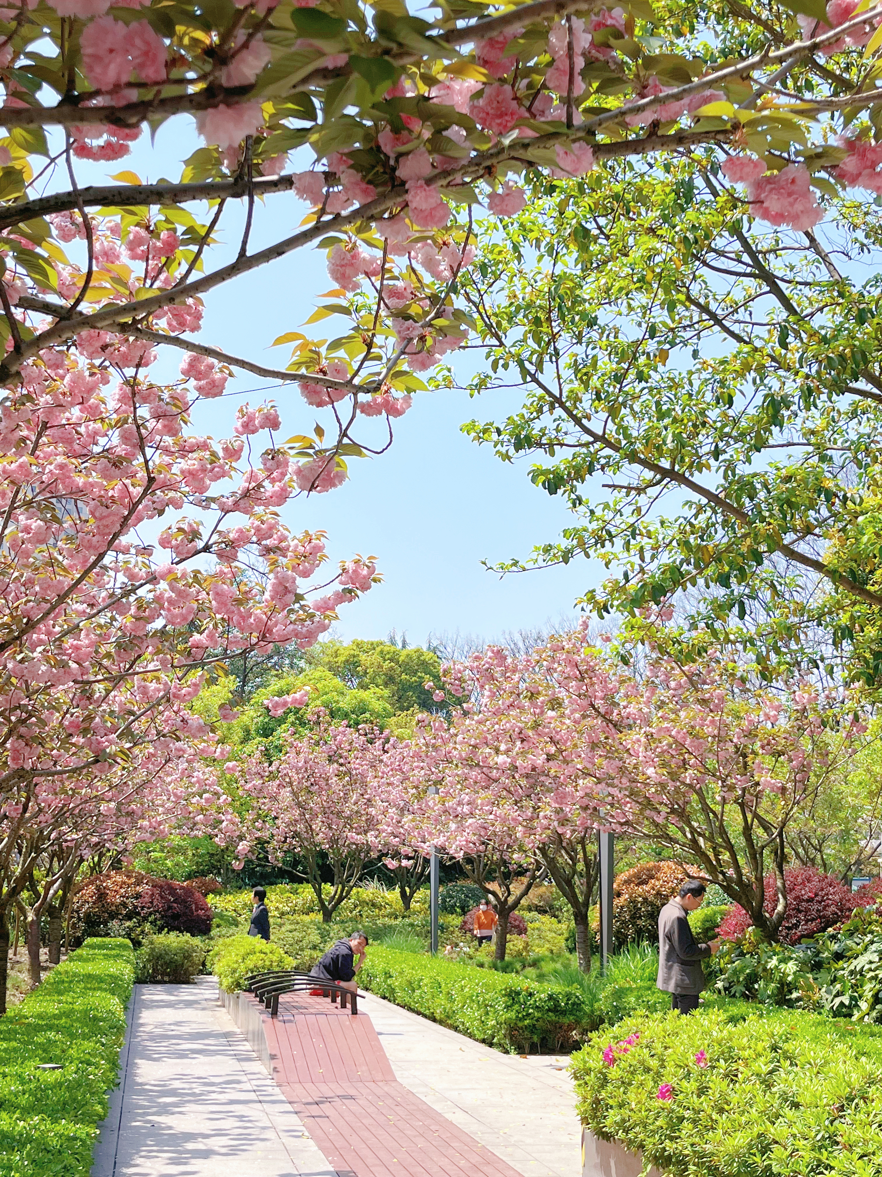 这个季节,绿地内晚樱盛开,仿佛一块娇艳的宝石点缀在繁华的闹市中。