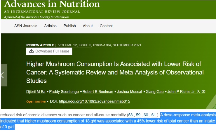 2021 年,美国宾夕法尼亚州立大学的团队发表在《营养进展》的一项研究发现,食用更多的蘑菇可以降低患癌症的风险。这项系统回顾和荟萃分析覆盖了 1966 年至 2020 年发表的 17 项癌症研究。研究人员分析了 19500 多名癌症患者的数据,探讨了食用蘑菇与癌症风险之间的关系。