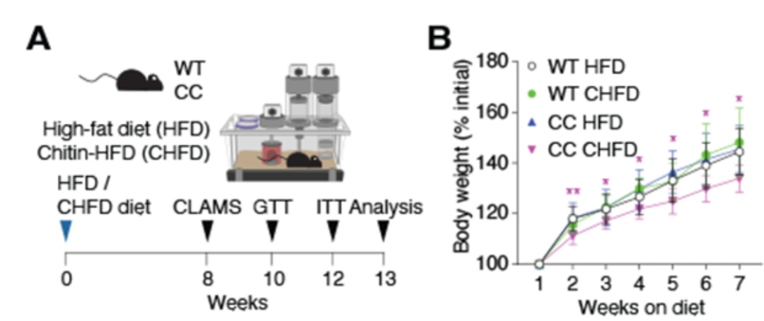 蘑菇中富含几丁质。这种成分,就是让金针菇“see you tomorrow”的“罪魁祸首”。2023 年,美国布法罗大学等机构的科研人员在国际知名学术期刊《科学》(Science)上发表了一篇重要论文。该研究发现,摄入膳食几丁质可以对免疫系统产生显著影响,而这种积极的免疫反应有助于减少体重的增加、降低体脂含量,并增强对肥胖的抵抗力。研究者对小鼠进行了两组实验,一组是给予它们含纤维素的高脂肪饲料(HFD),另一组则是含有几丁质纤维的等热量高脂肪饲料(CHFD)。两种饲料唯一的区别,在于纤维素的种类是不是几丁质。经过对比观察,研究者发现,与接受含有几丁质纤维高脂肪饲料喂养的小鼠相比,用含纤维素高脂肪饲料喂养的小鼠体重明显增长。而令人惊喜的是,几丁质酶缺陷的小鼠在接受含有几丁质纤维高脂肪饲料喂养后,其体重出现下降趋势,肥胖和脂肪质量也显著减少。