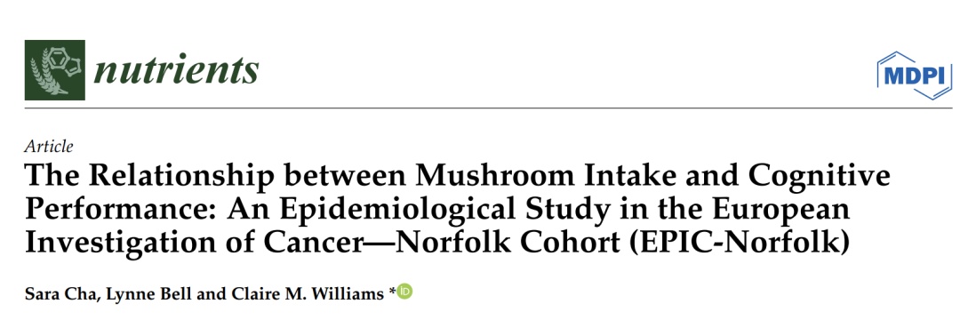[2]Cha, S.; Bell, L.; Williams, C.M. The Relationship between Mushroom Intake and Cognitive Performance: An Epidemiological Study in the European Investigation of Cancer—Norfolk Cohort (EPIC-Norfolk). Nutrients 2024, 16, 353. https://doi.org/10.3390/nu16030353