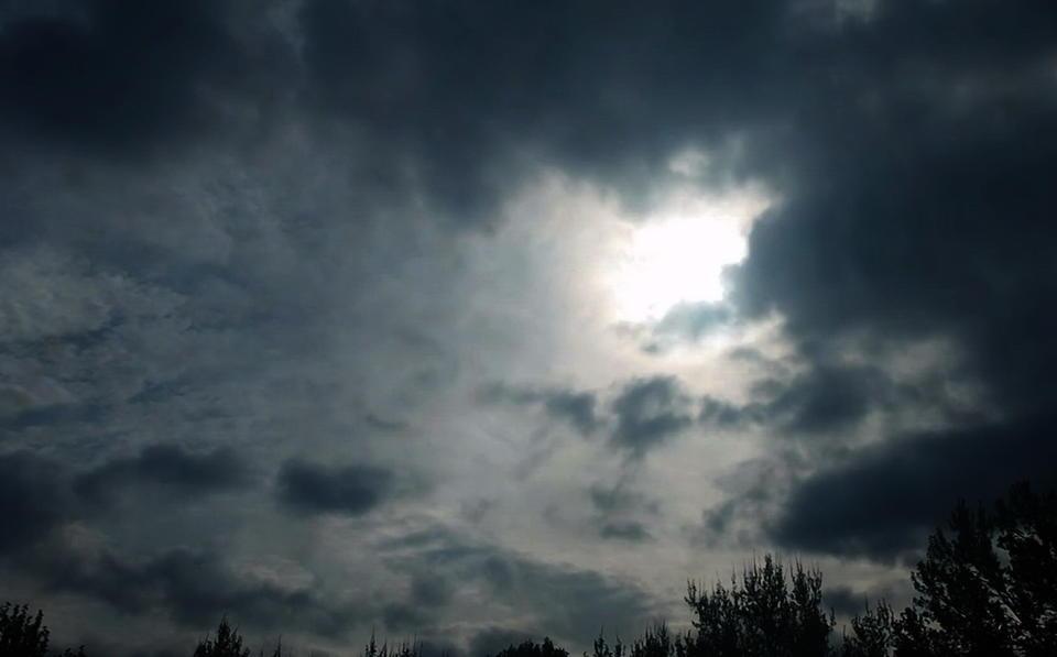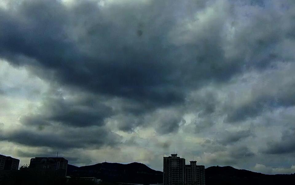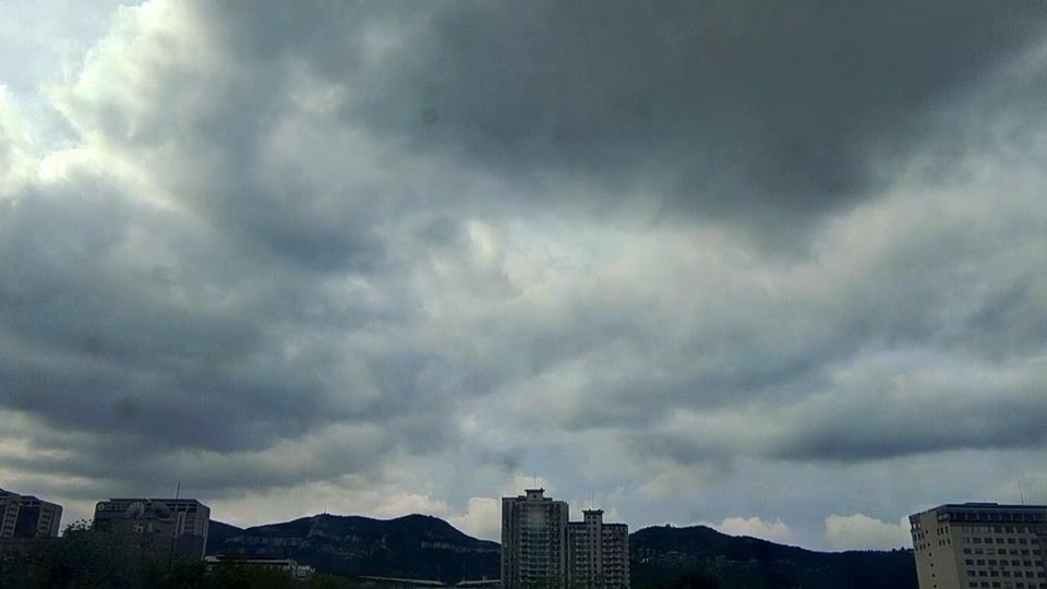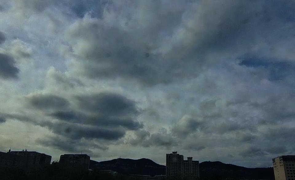 4月14日早晨济南阳光灿烂,8点后却有大团黑云从东南方贴着山尖滚滚而来,天空顿时变得昏暗。