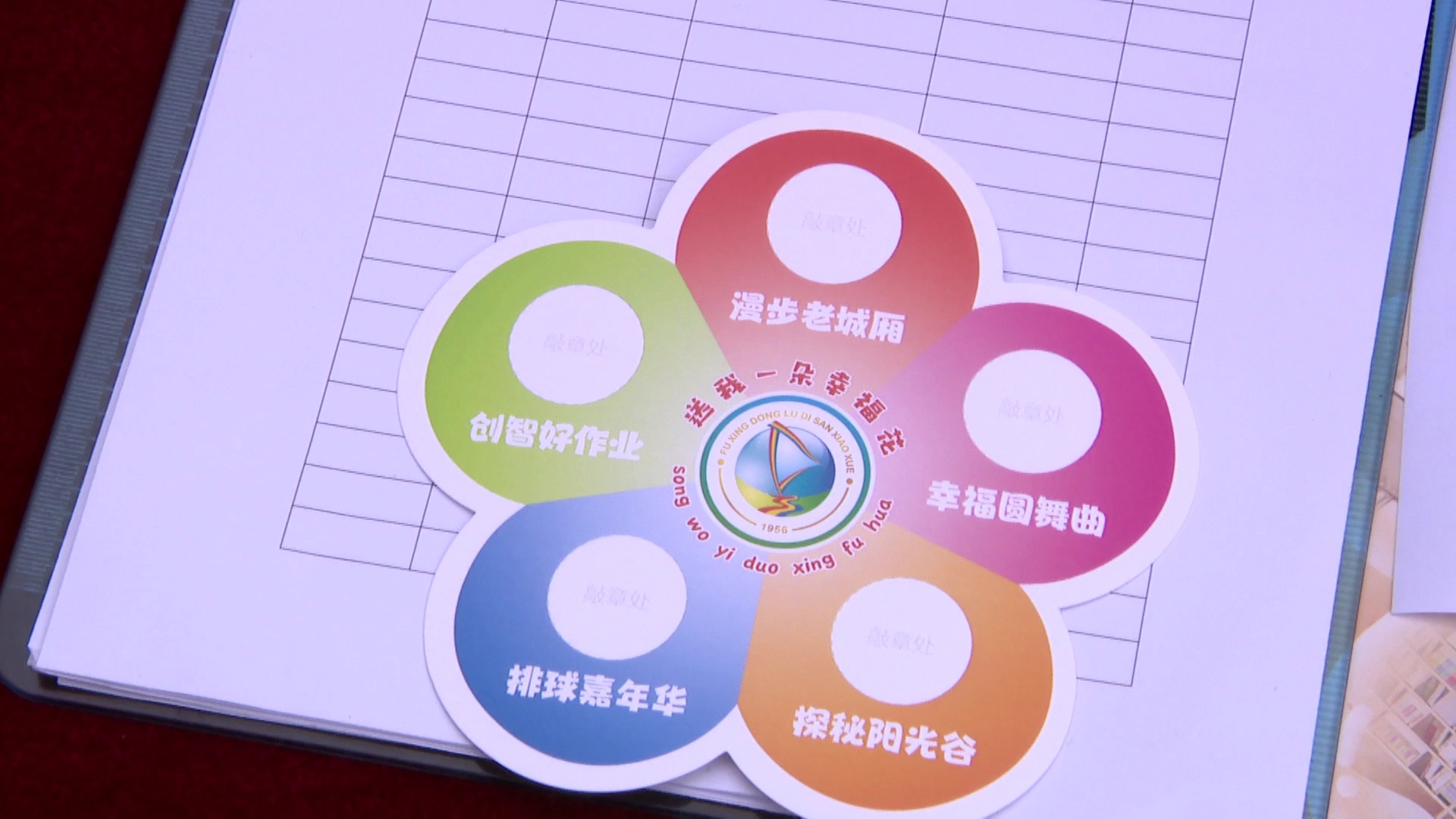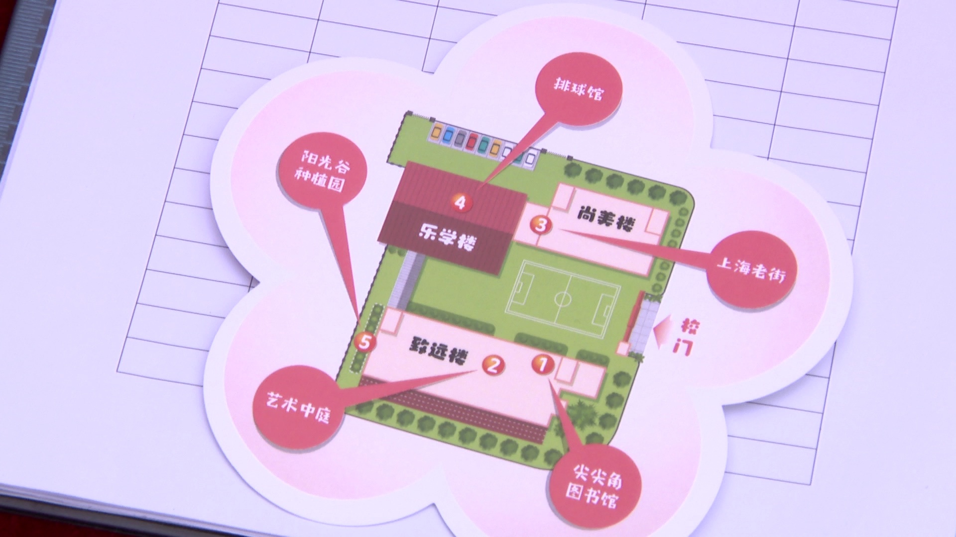 来到校门口,家长领取校园介绍手册,小朋友便可得到一朵“幸福花”。事实上“幸福花”是一张争章卡,每一朵花瓣代表德智体美劳的一项课程活动,寓意孩子们在幸福校园全面发展,反面是校园地图和本次参观体验的五个打卡点,分别是“探秘阳光谷”“创智好作业”“漫步老城厢”“幸福圆舞曲”“排球嘉年华”。