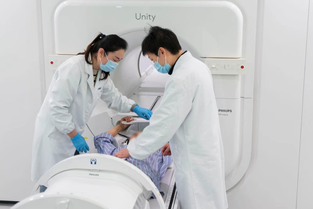 2024年4月9日,复旦大学附属肿瘤医院运用上海市首台磁共振加速器,对一位胰腺癌患者进行放射治疗。通过集成磁共振扫描仪和加速器,让医生能够在放射治疗过程中实时观察肿瘤状态和周围组织的运动,精准引导放射线照射肿瘤,最大程度上减少对正常组织的损伤,减少放射治疗的并发症。由于磁共振影像软组织分辨率较高,相比于采用CT图像引导的传统放疗,新的设备能够大大提高医生对于肿瘤和正常器官位置、大小、边界的精细判断,尤其是实现了根据每日解剖结构变化实时调整治疗计划,使得胰腺癌精准放疗和个体化治疗都提升到一个新高度,为下一步提高胰腺癌精准放疗疗效奠定了坚实基础。