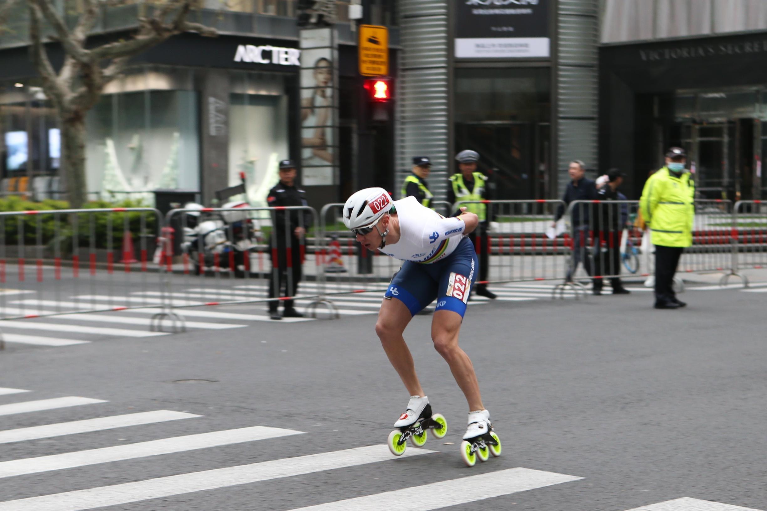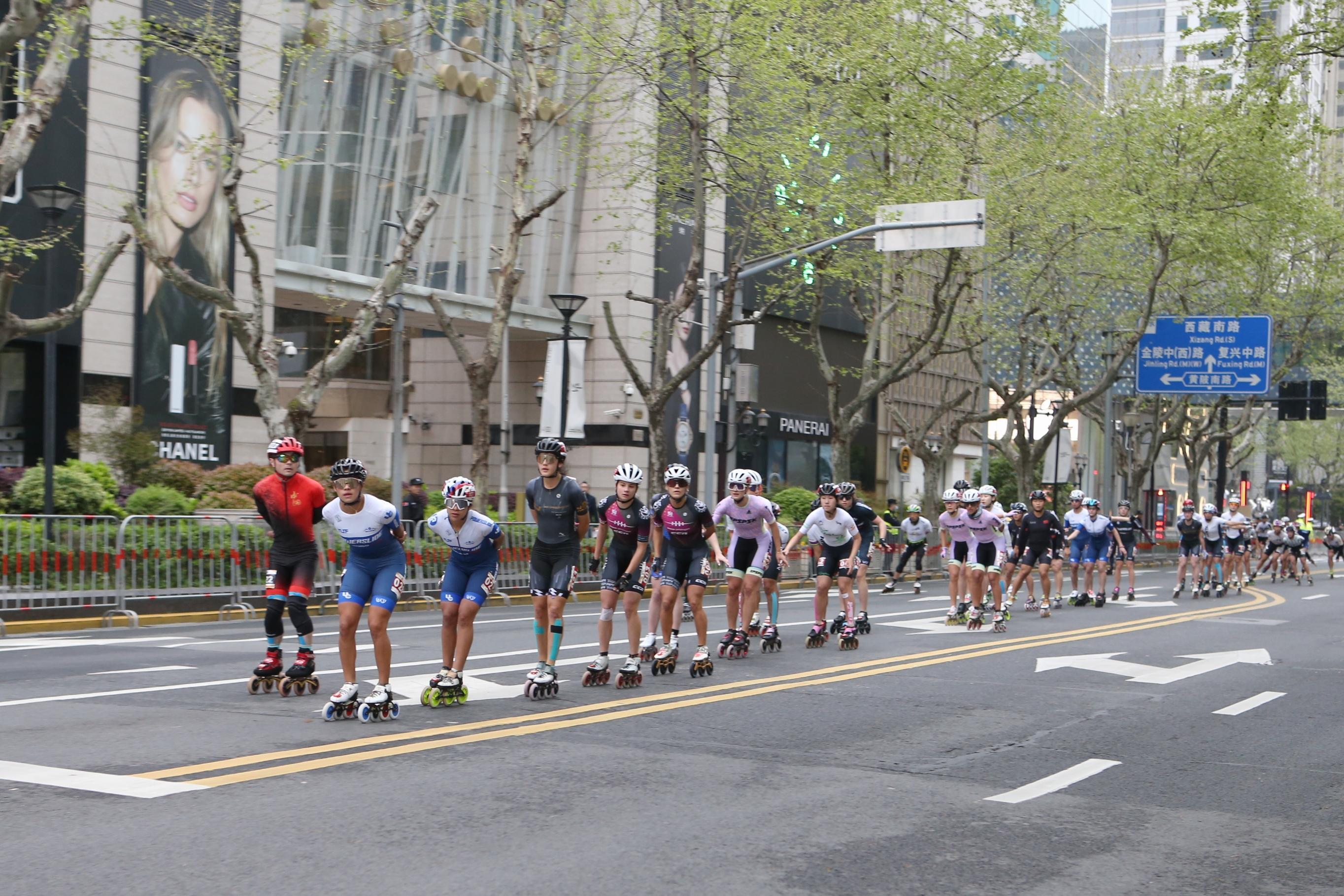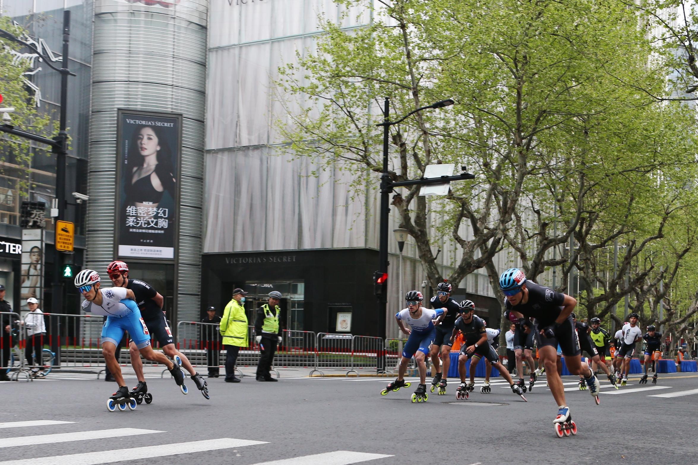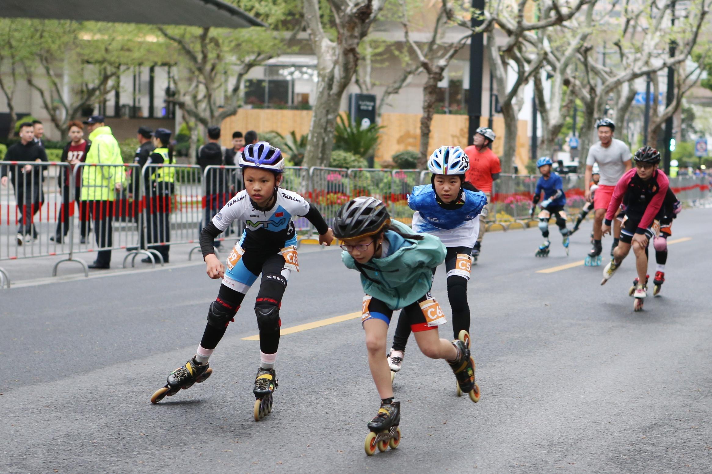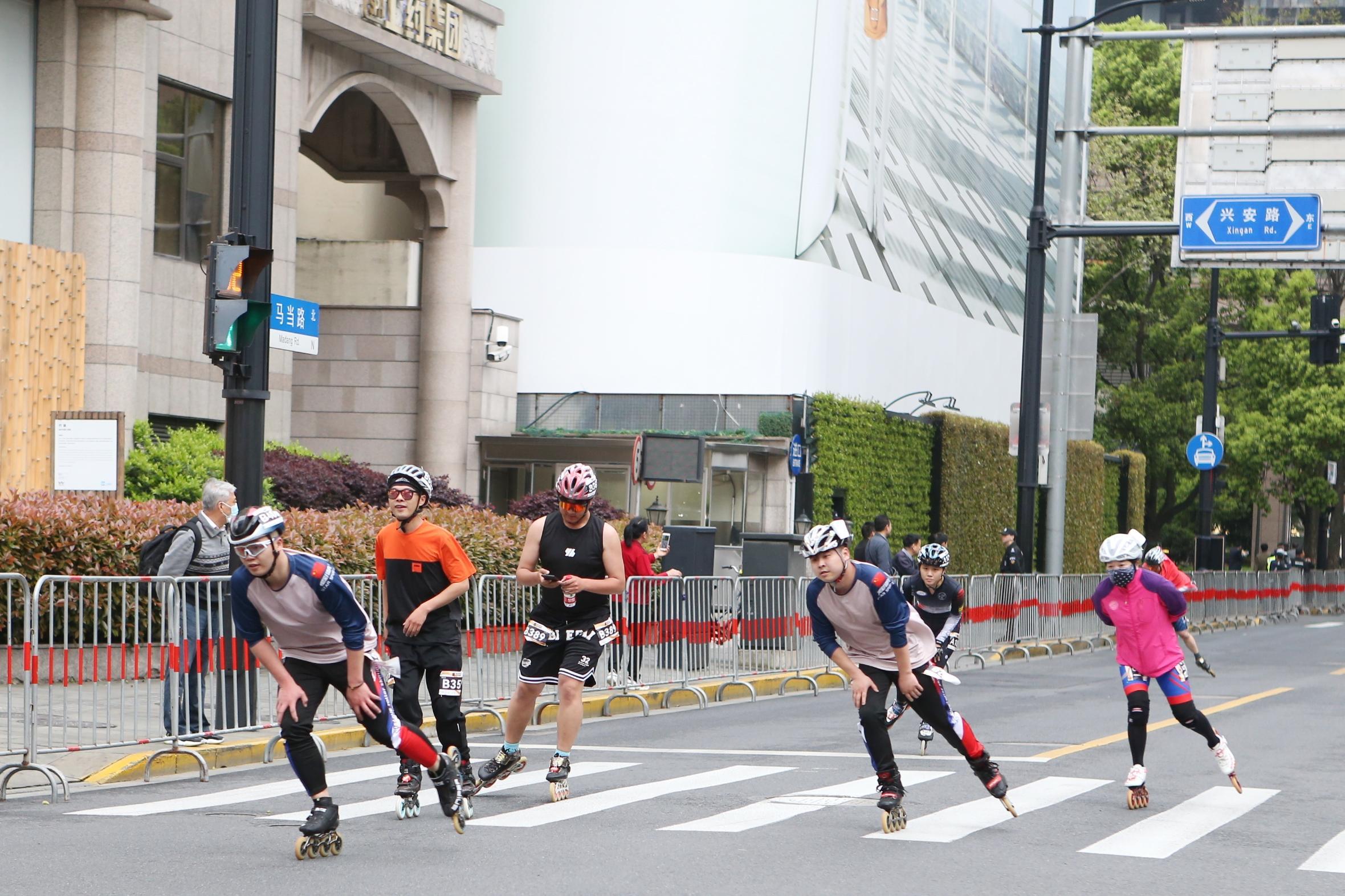比赛刚过5分钟,已经有轮滑运动员来到了位于5公里处的淮海中路马当路路口,在全体轮滑参赛者中处于遥遥领先的位置。记者在现场观察到,随着更多运动员呈一字型队列通过,赛道两旁手持充气棒的观众不遗余力地为选手加油打气,还有穿着一身红的腰鼓队阿姨迎合着跑者的节奏“敲锣打鼓”。
