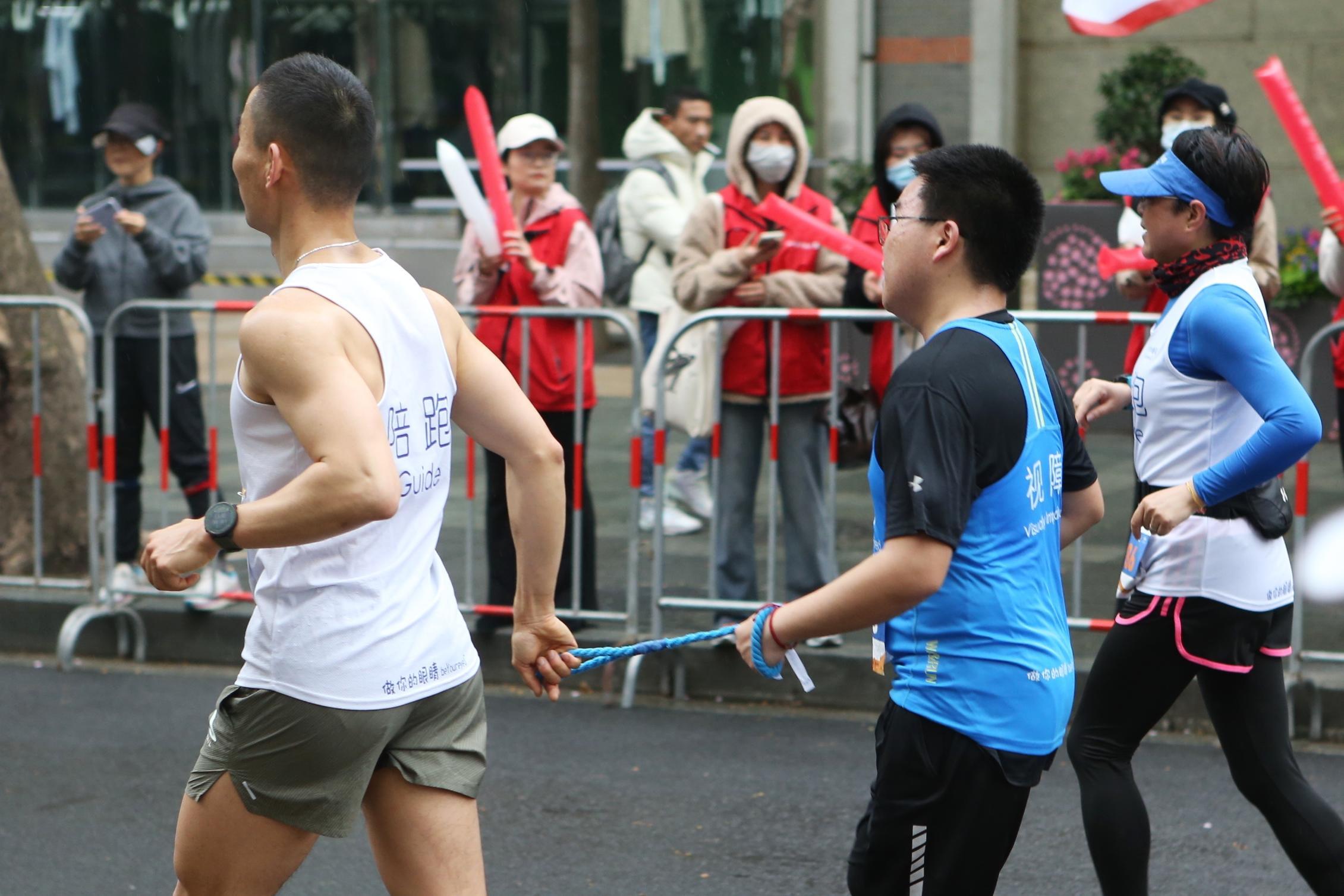 每一次的马拉松赛,都会有视障选手的参与,“黄马”也不例外。陪跑选手用一根带子牵引着,引导前进的方向,人与人之间的真情,在短短一根蓝色带子上得以传递。