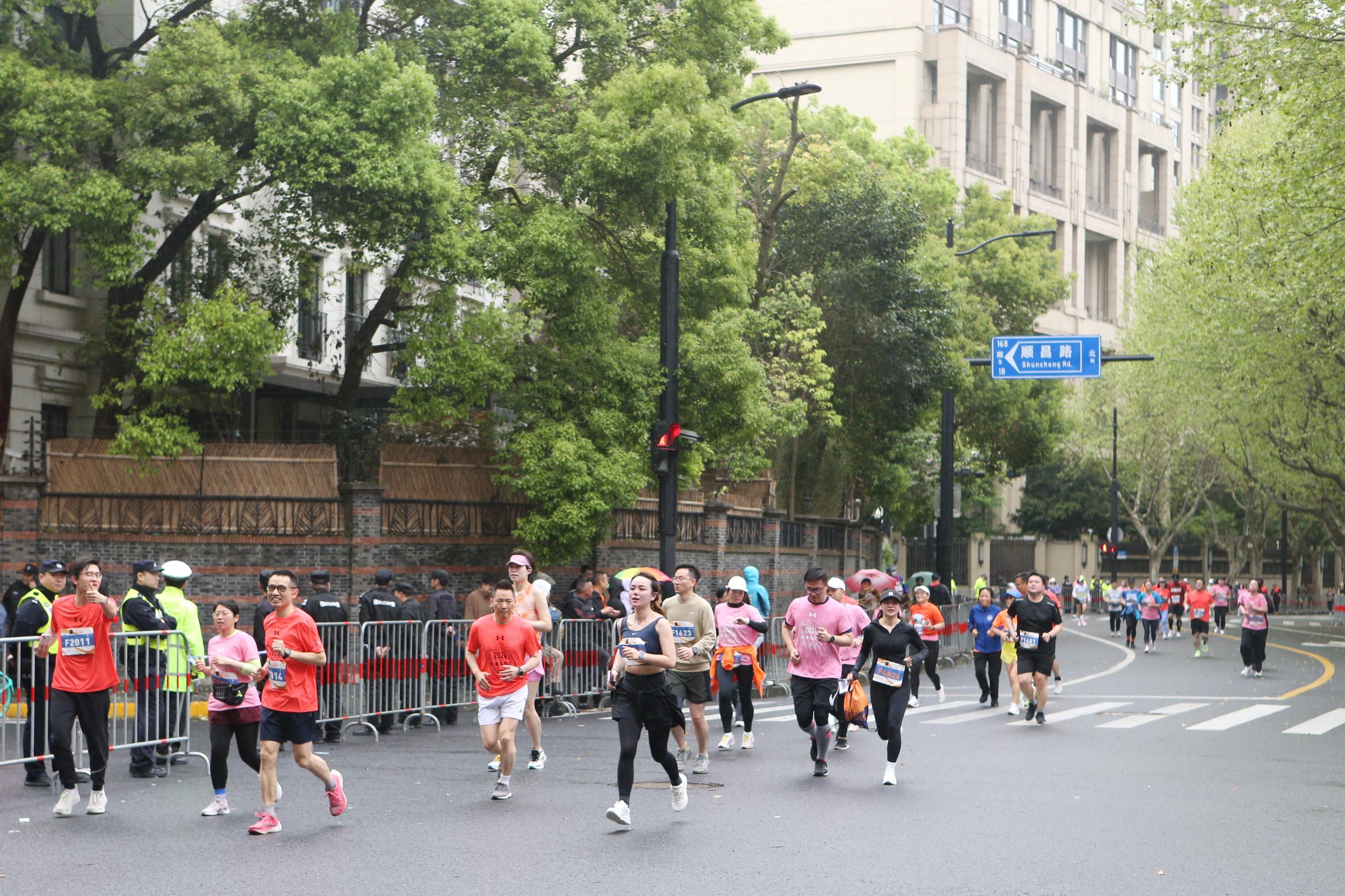 随着轮滑组的比赛进入尾声阶段,中共一大会址路段迎来了路跑组选手。天公不作美,渐渐下起了小雨,但并没有妨碍运动员勇往直前的步伐。许多跑者面带微笑,边跑边挥动双手与观众互动,面对赛道两旁的镜头也会摆出各种pose ,摄影师们得以记录下一张张灿烂的笑脸。