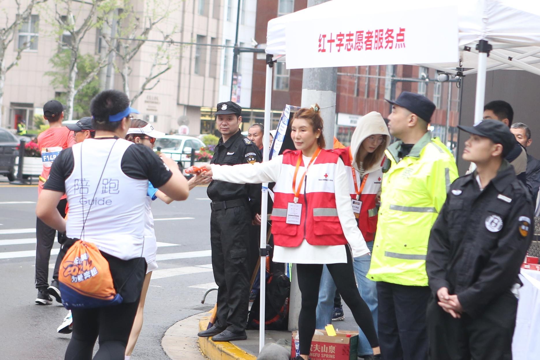 路边的红十字志愿者服务点也是路跑赛事中不可或缺的元素。记者注意到,许多跑者在经过6公里处后,会有饥饿、抽筋等状况发生,志愿者便会提供必要的帮助,助力他们继续前行。