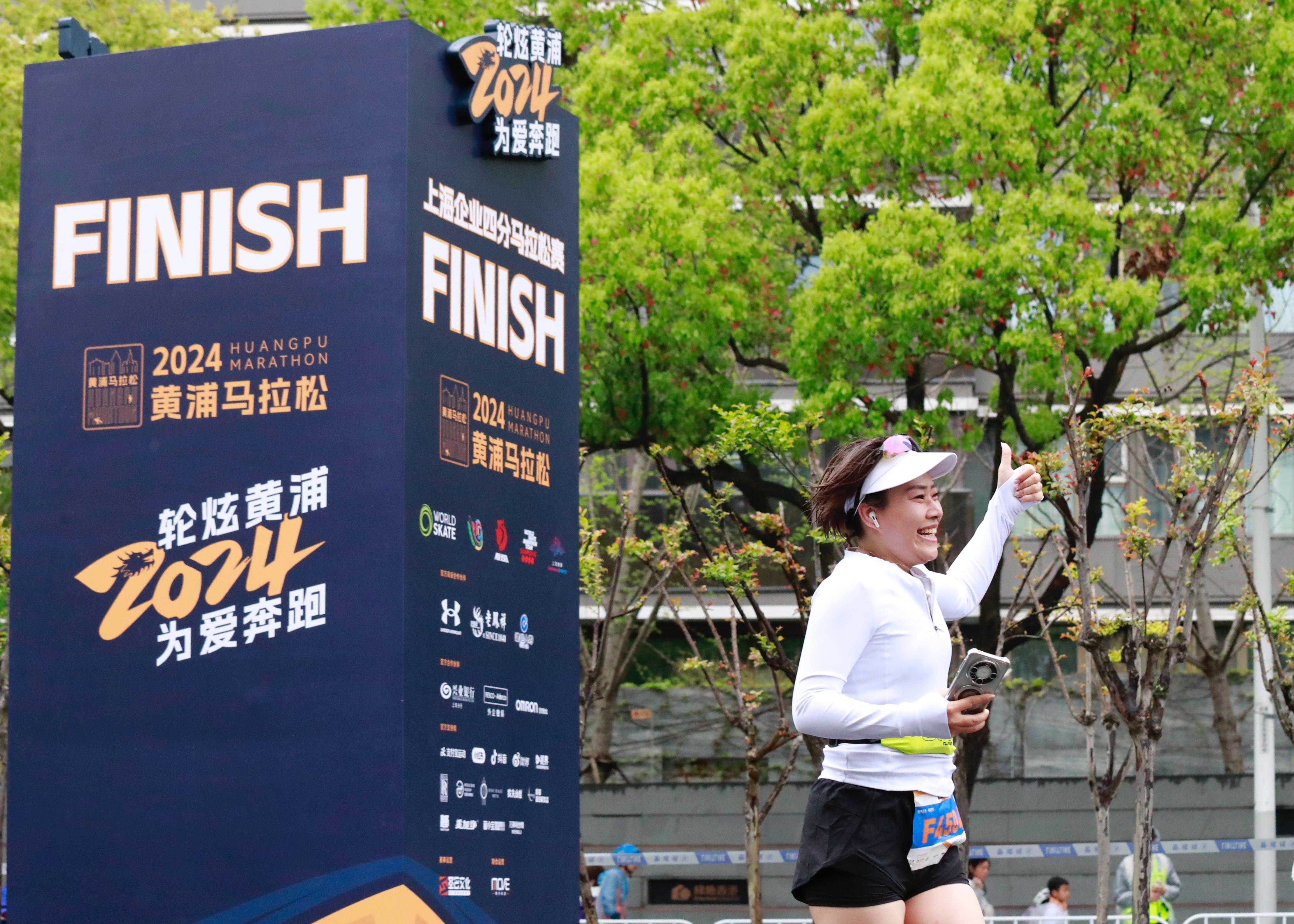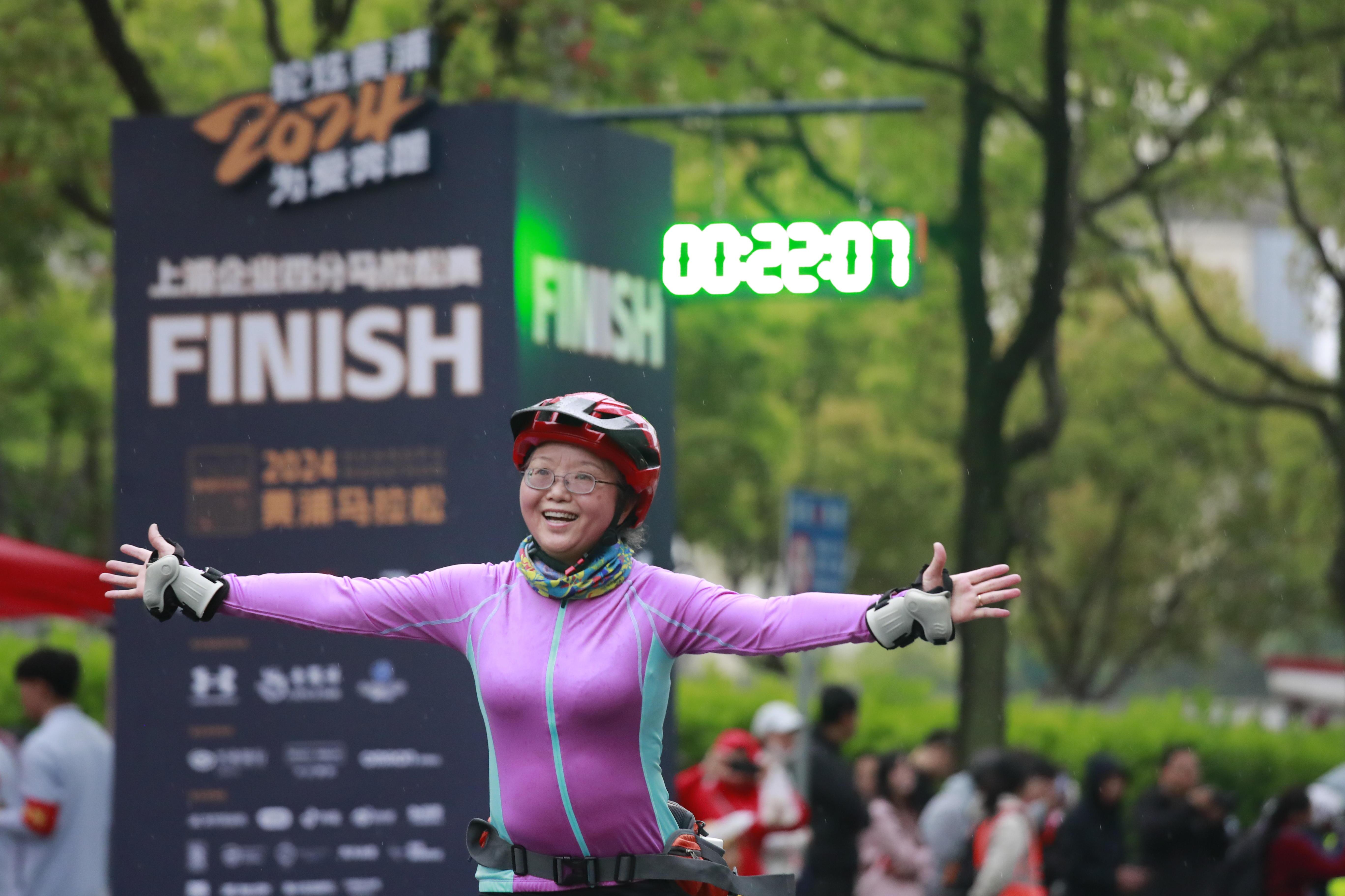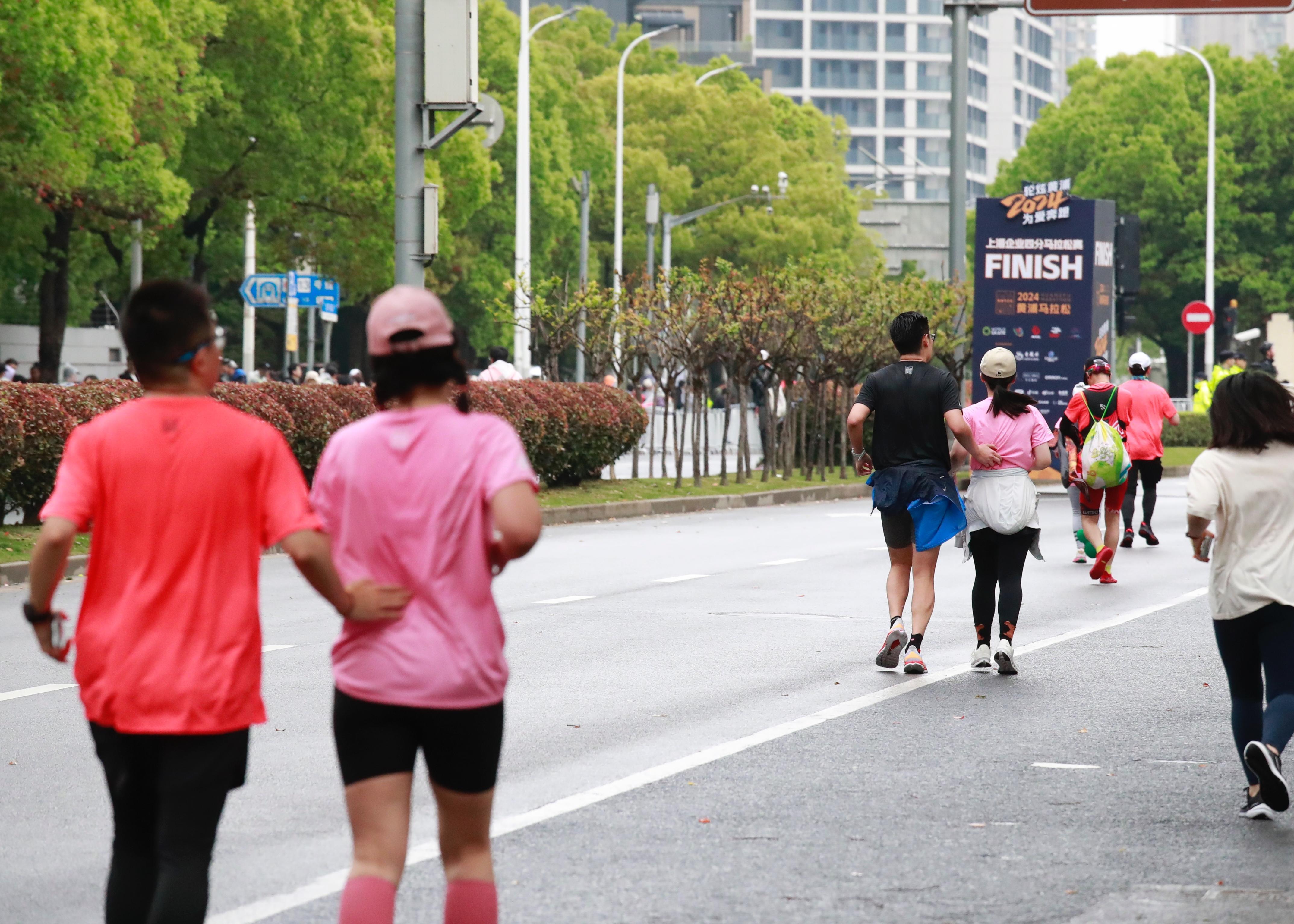 和轮滑四分马共享一条赛道的路跑四分马终点同样设在世博会博物馆。路跑四分马赛道上有着小“陪跑”员、有着年长的马拉松爱好者,还有着以家庭为单位的跑者……他们有的手拉手,有的“助力”着同伴,彼此加油打气冲向终点。
