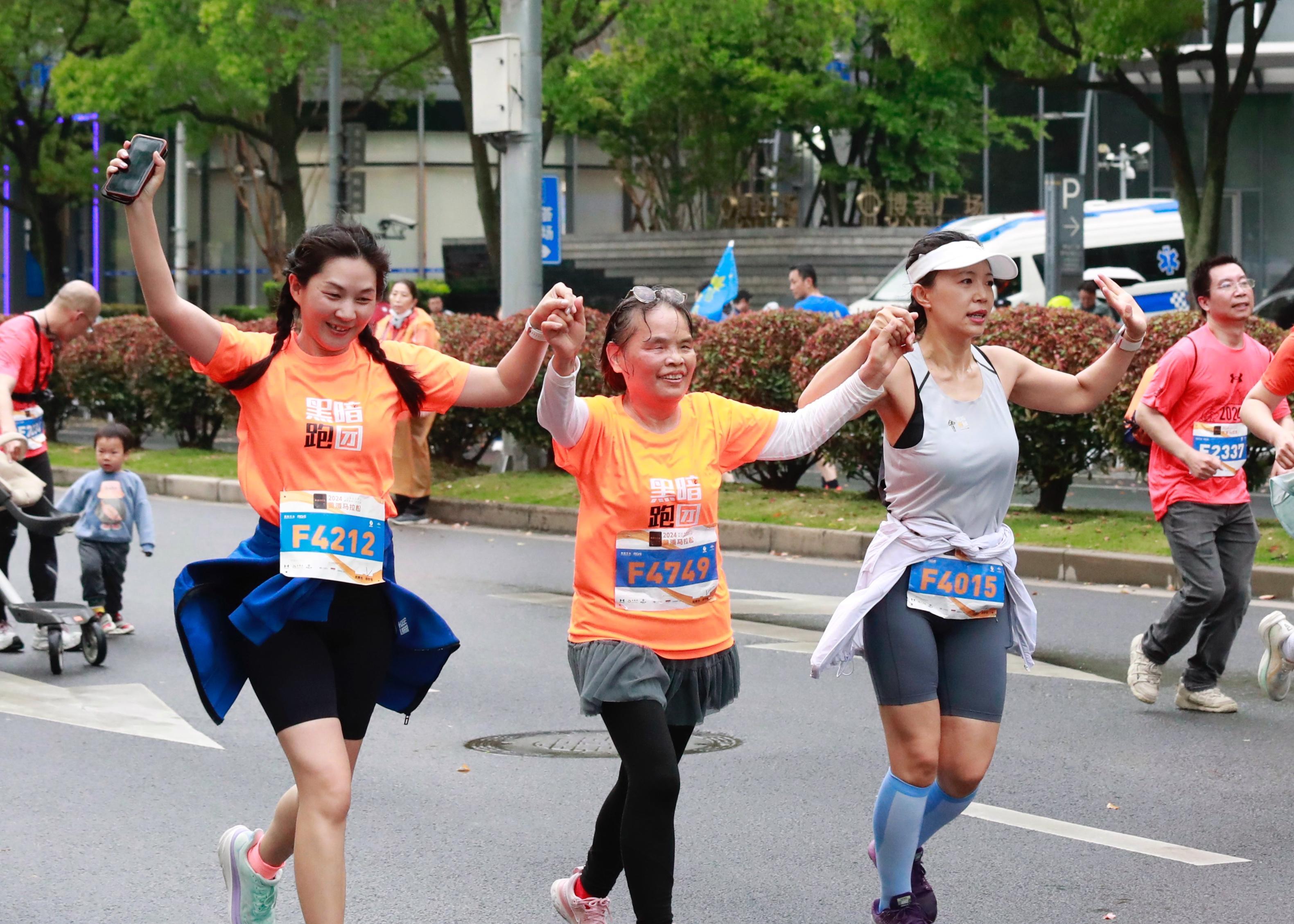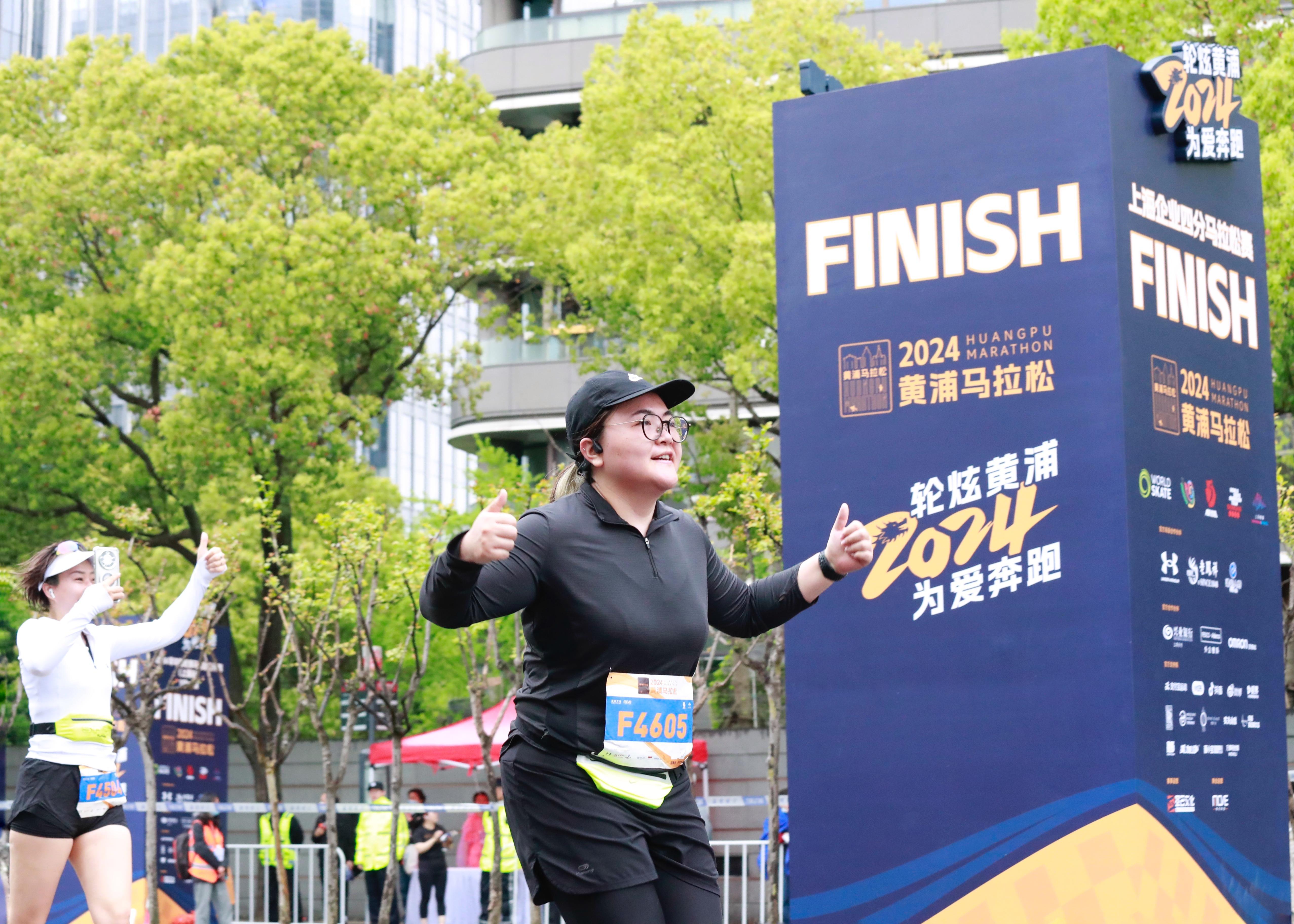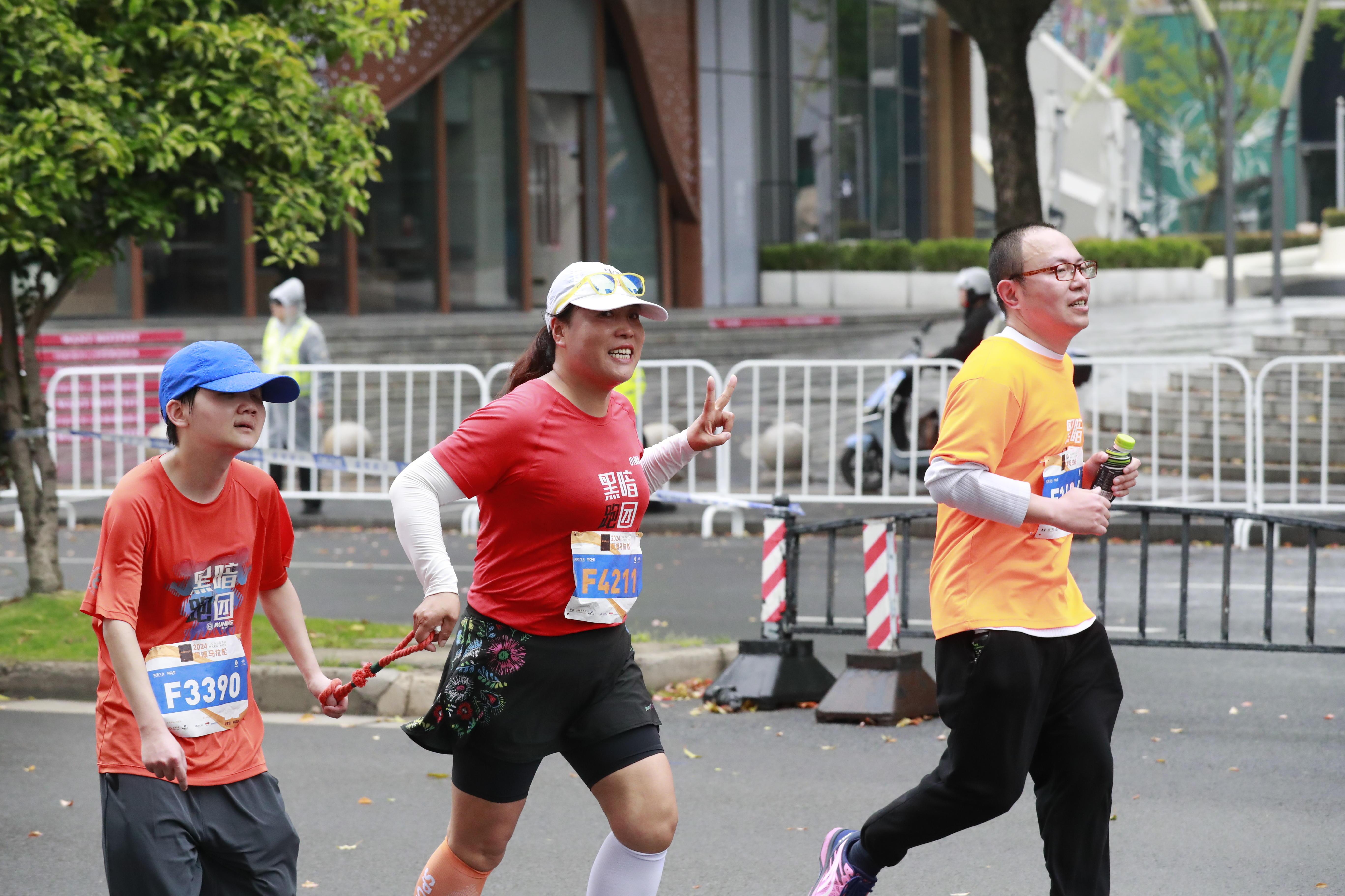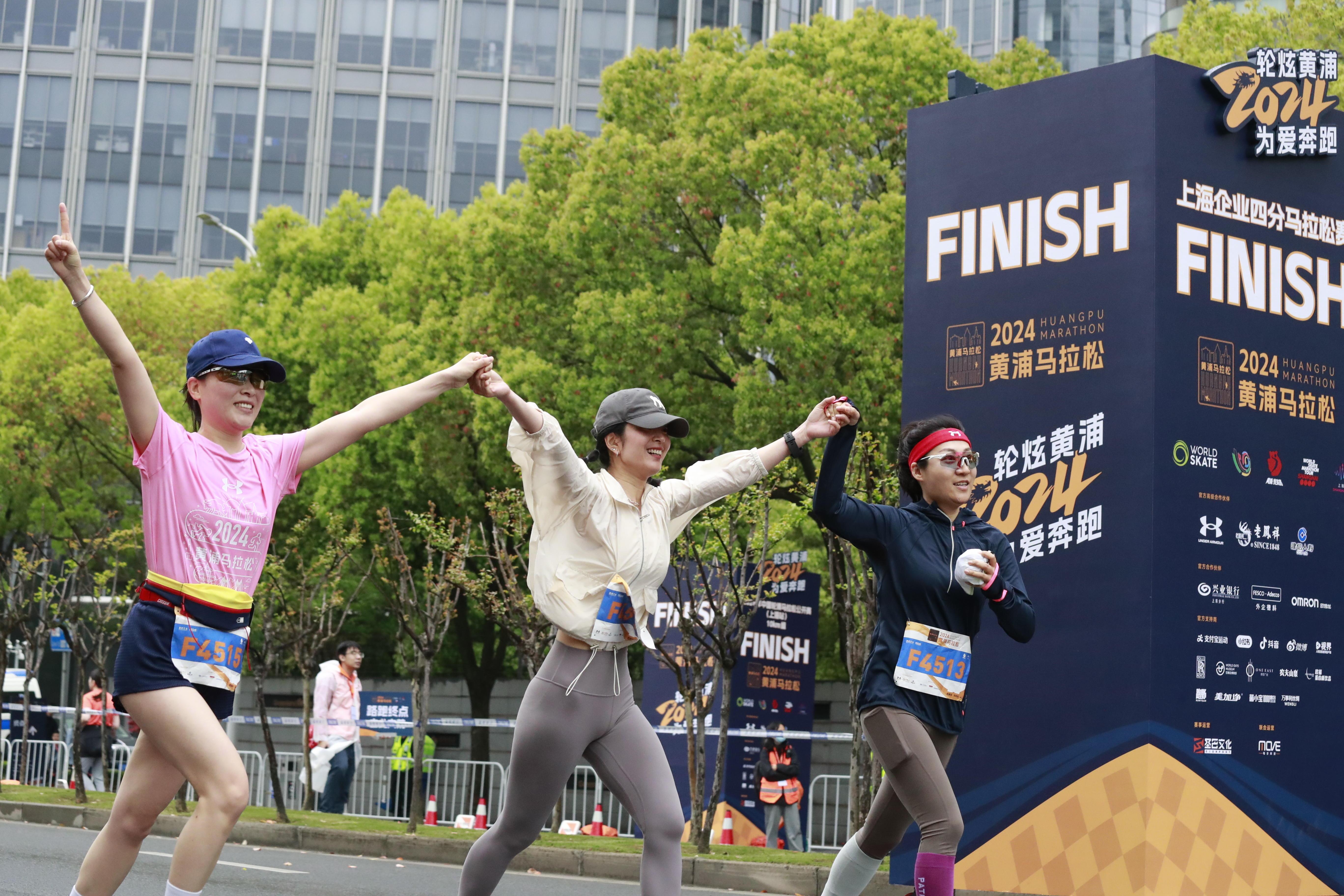 和轮滑四分马共享一条赛道的路跑四分马终点同样设在世博会博物馆。路跑四分马赛道上有着小“陪跑”员、有着年长的马拉松爱好者,还有着以家庭为单位的跑者……他们有的手拉手,有的“助力”着同伴,彼此加油打气冲向终点。