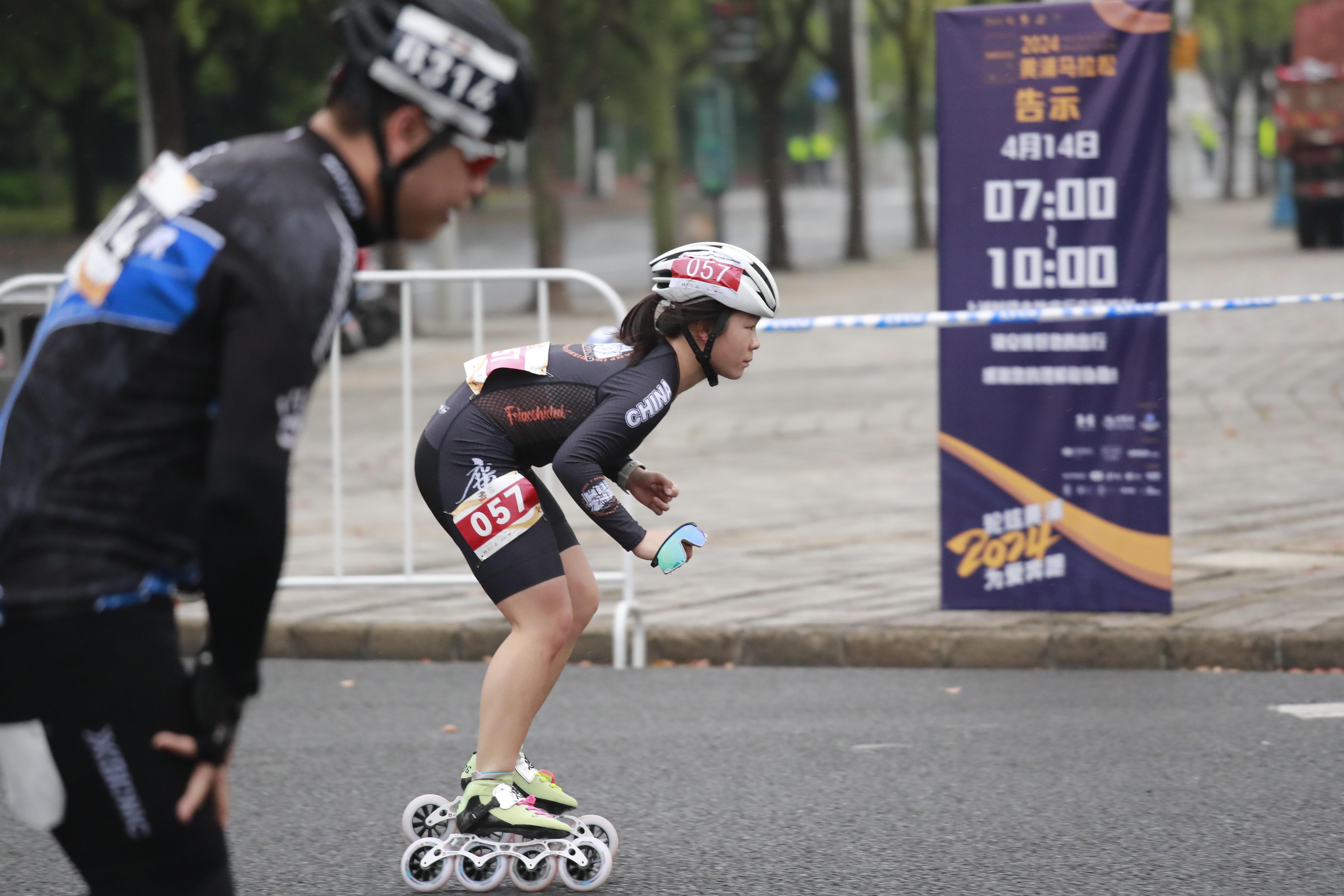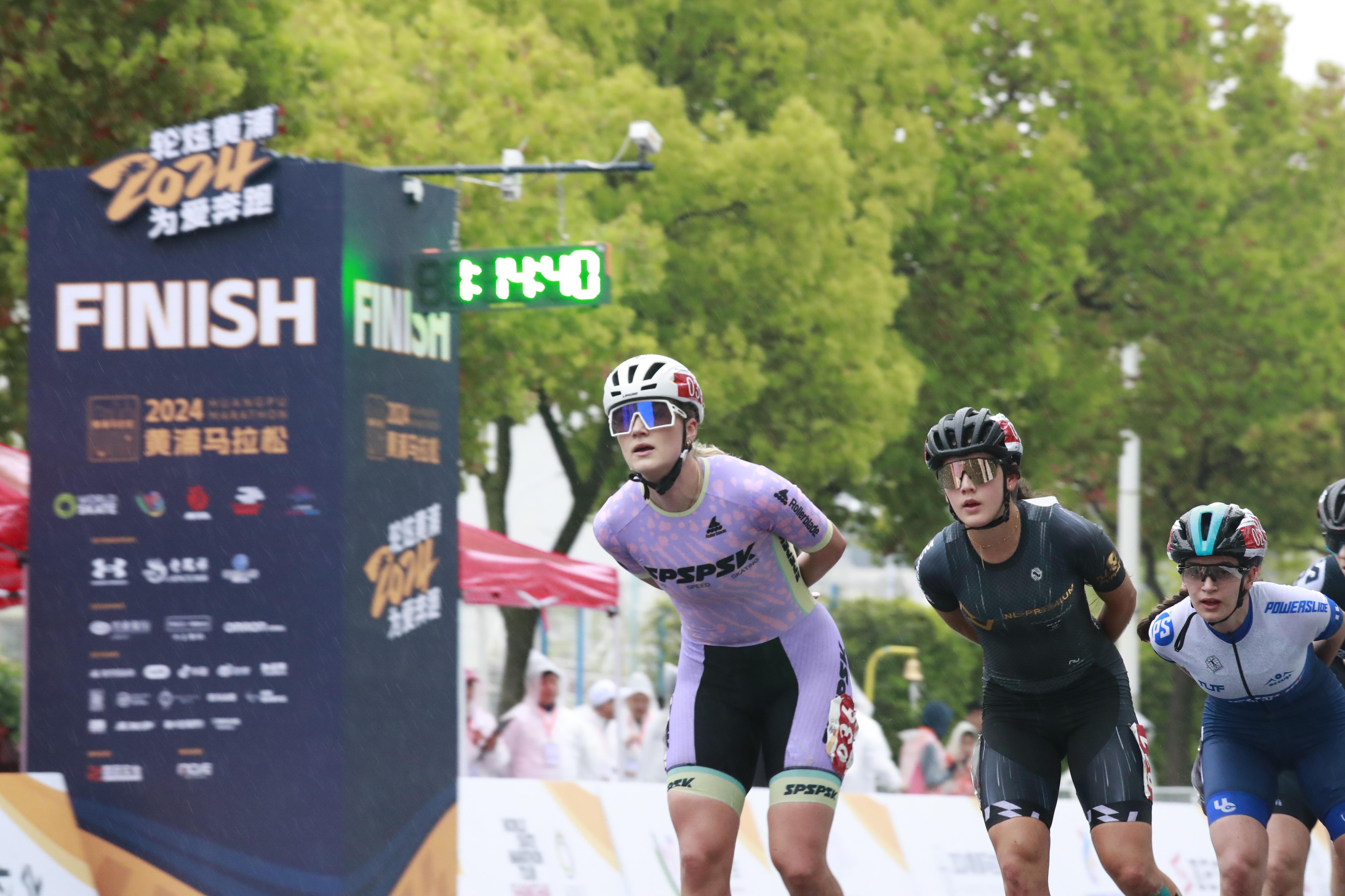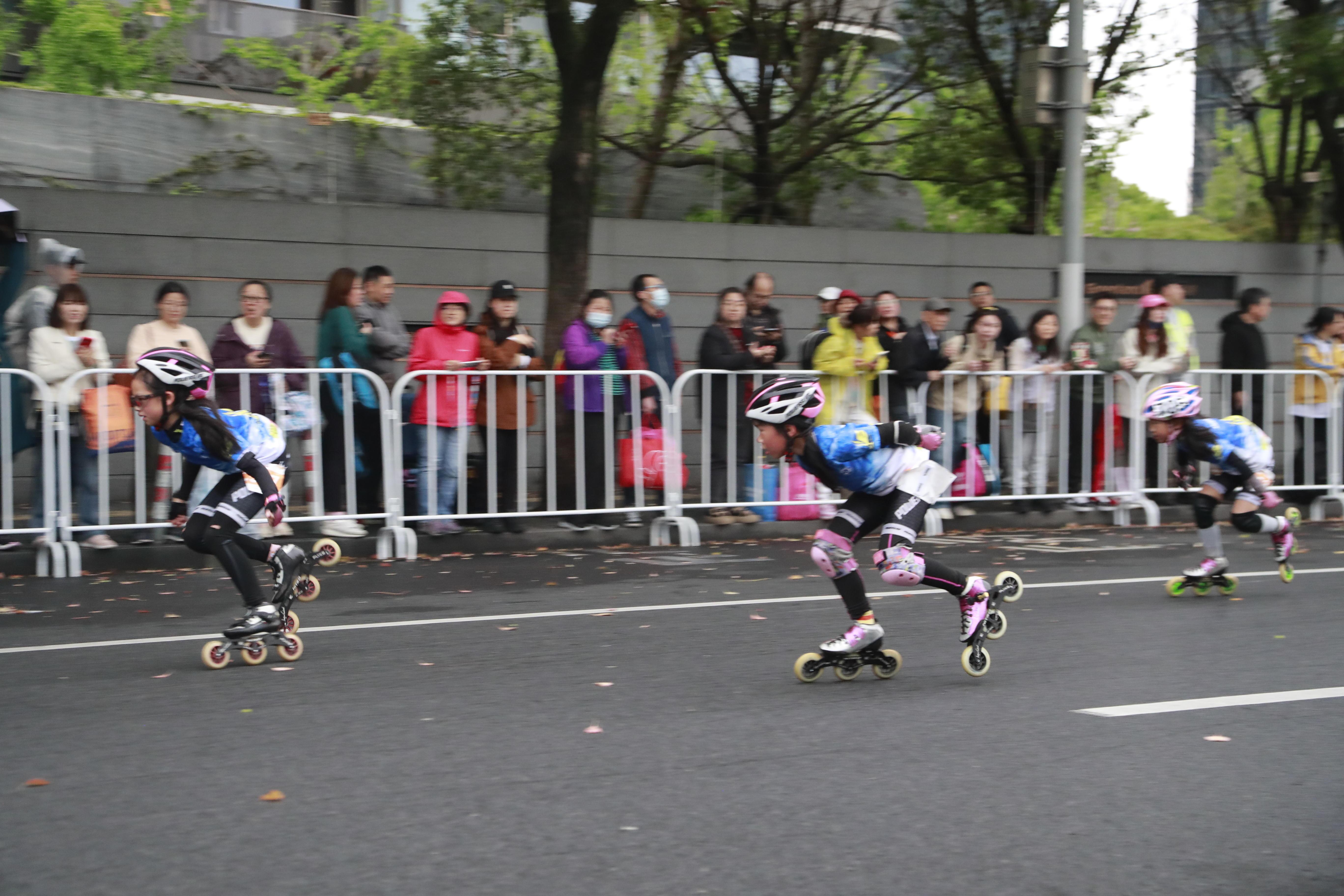 在龙华东路68号的轮滑全马和半马终点,国内外选手奋力角逐。