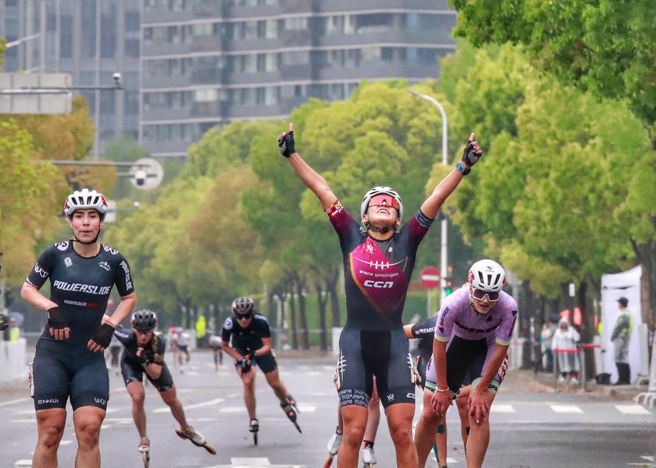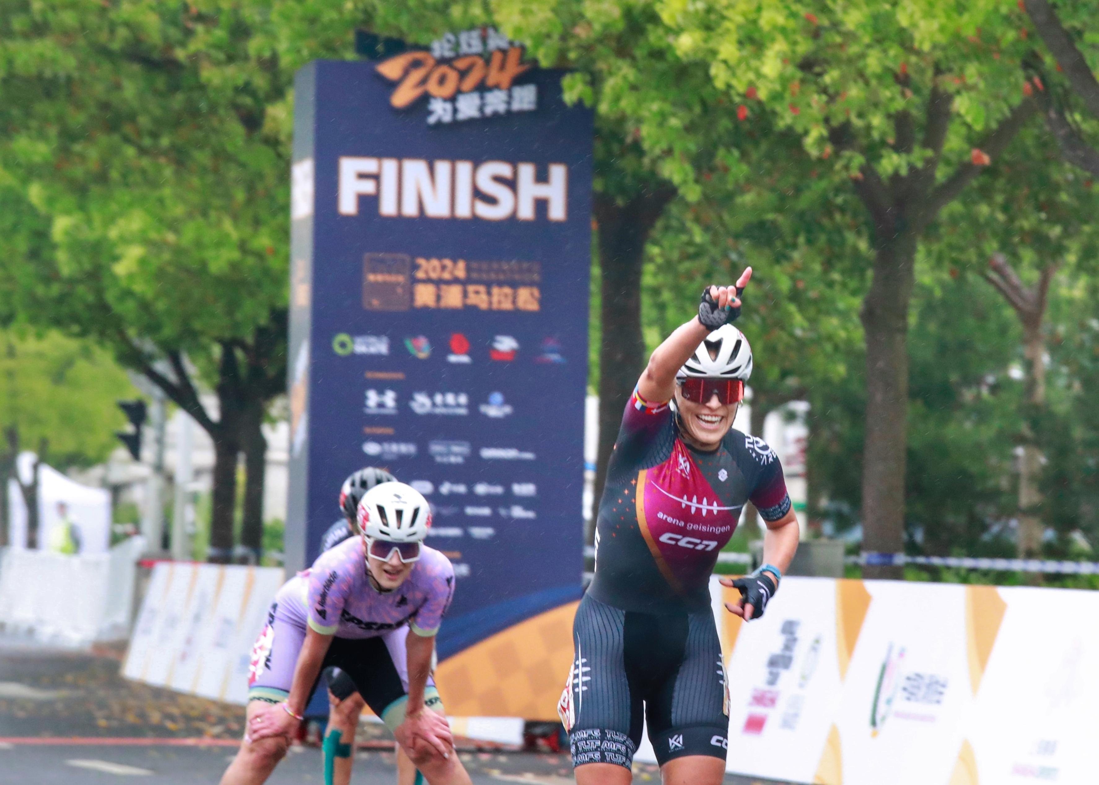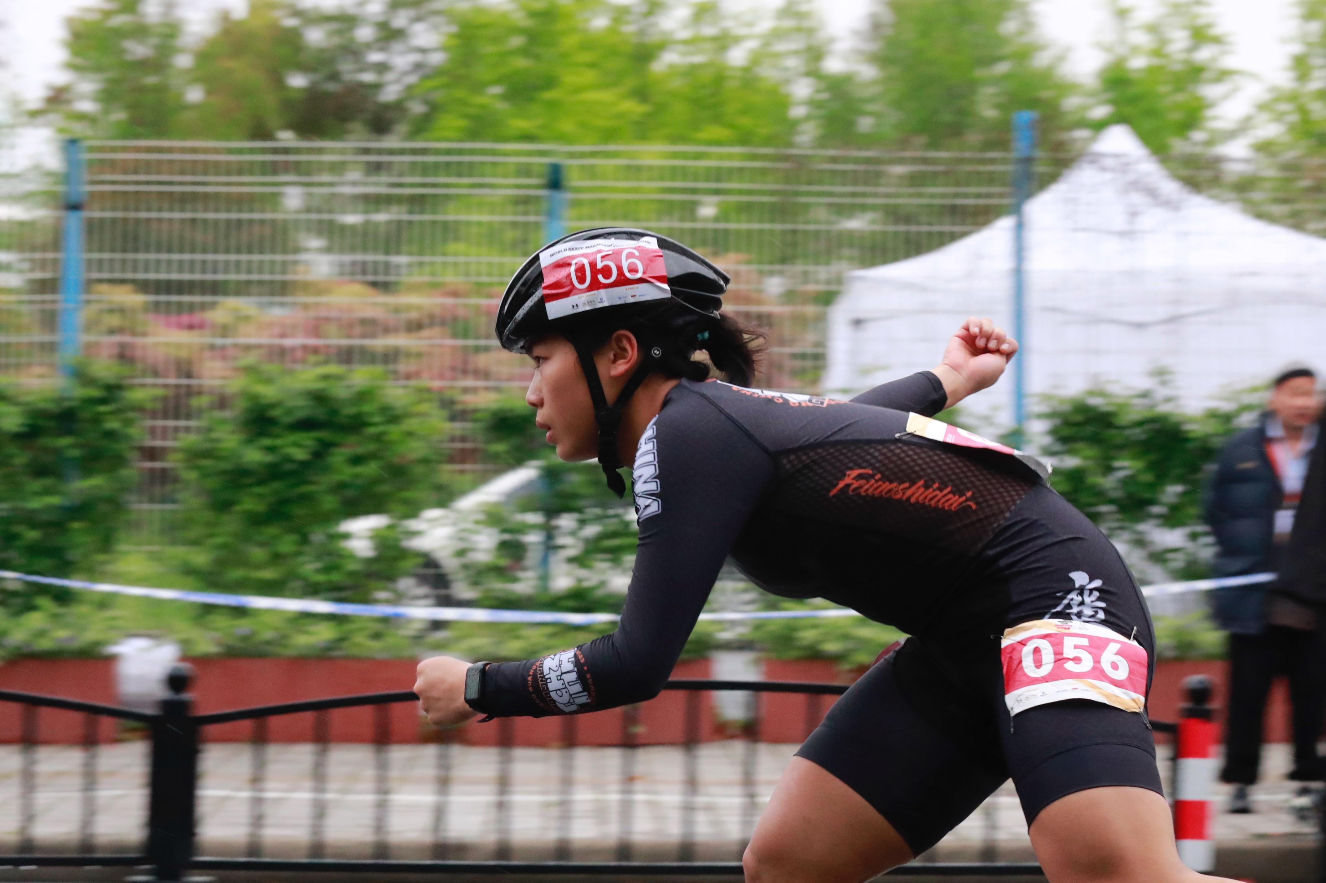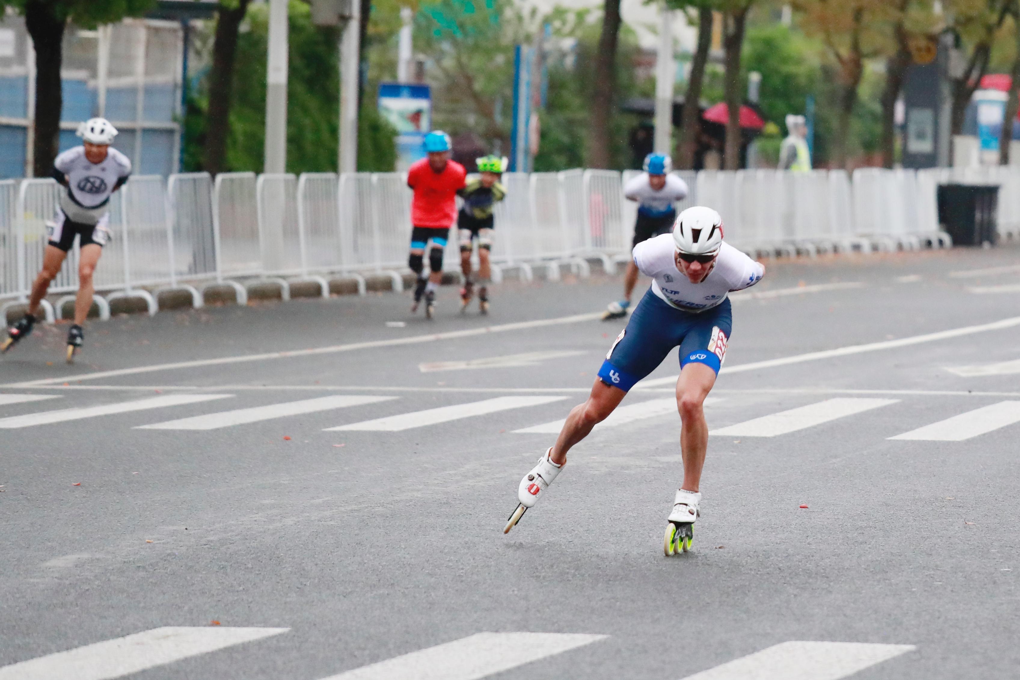 在龙华东路68号的轮滑全马和半马终点,国内外选手奋力角逐。
