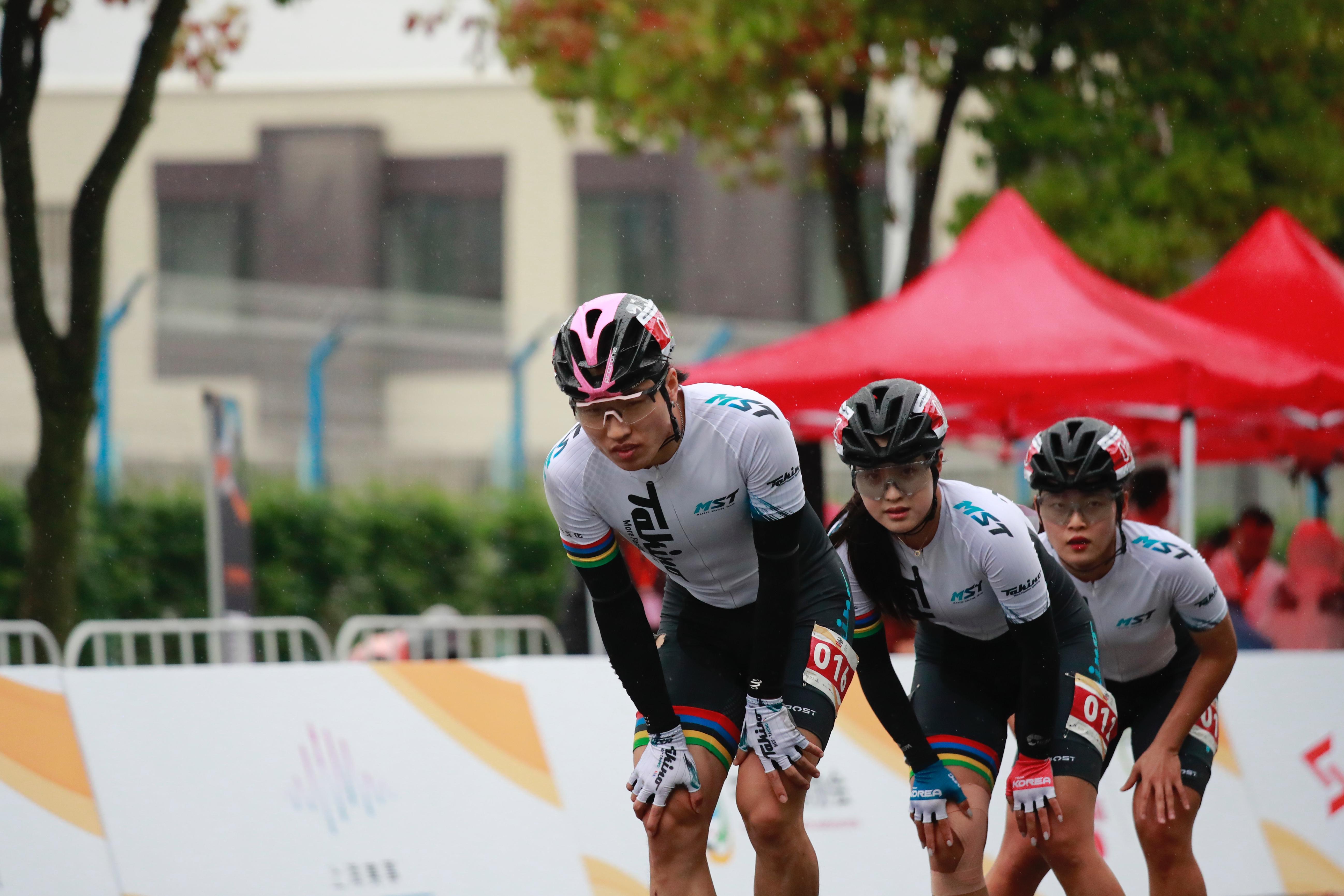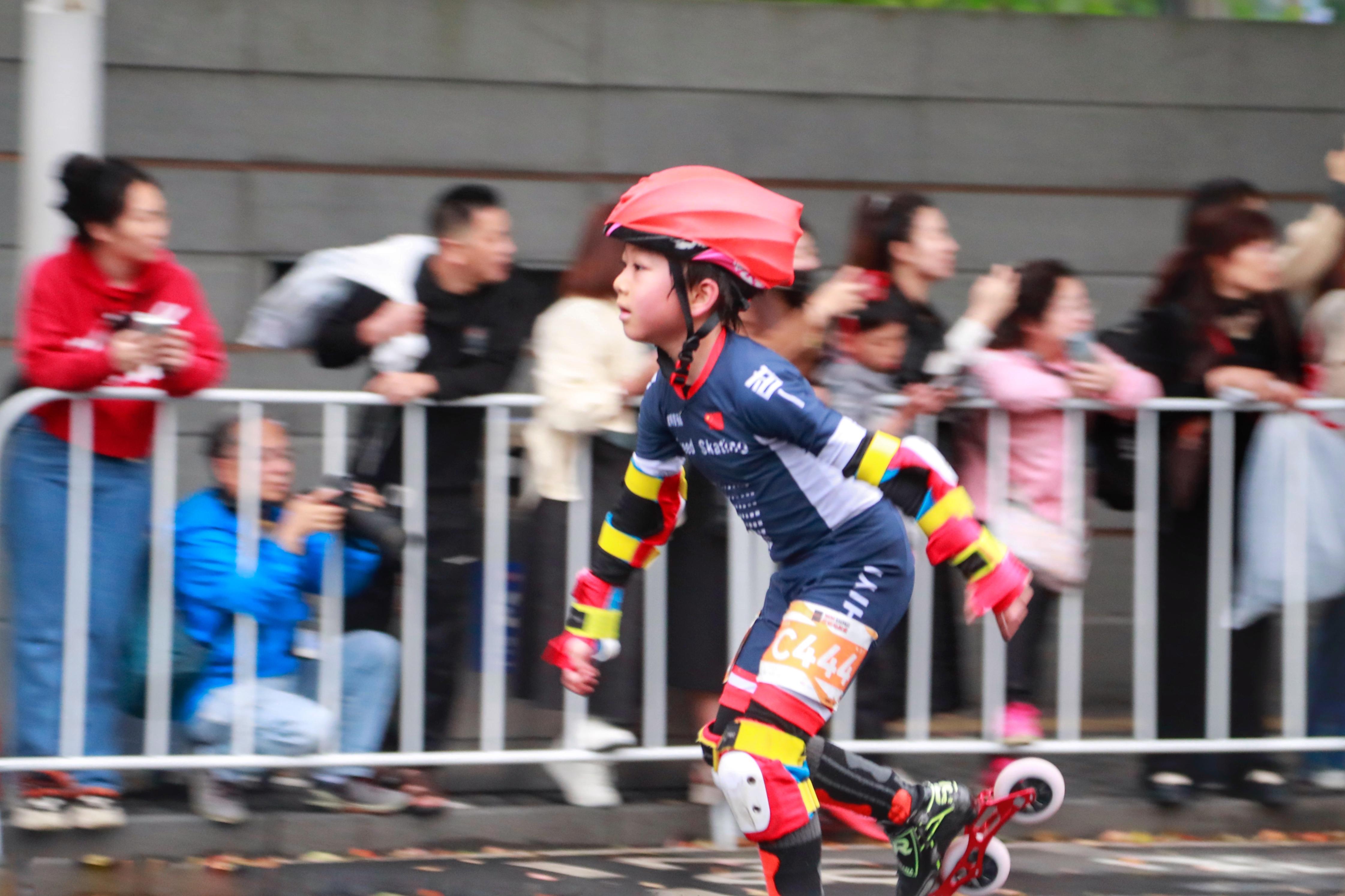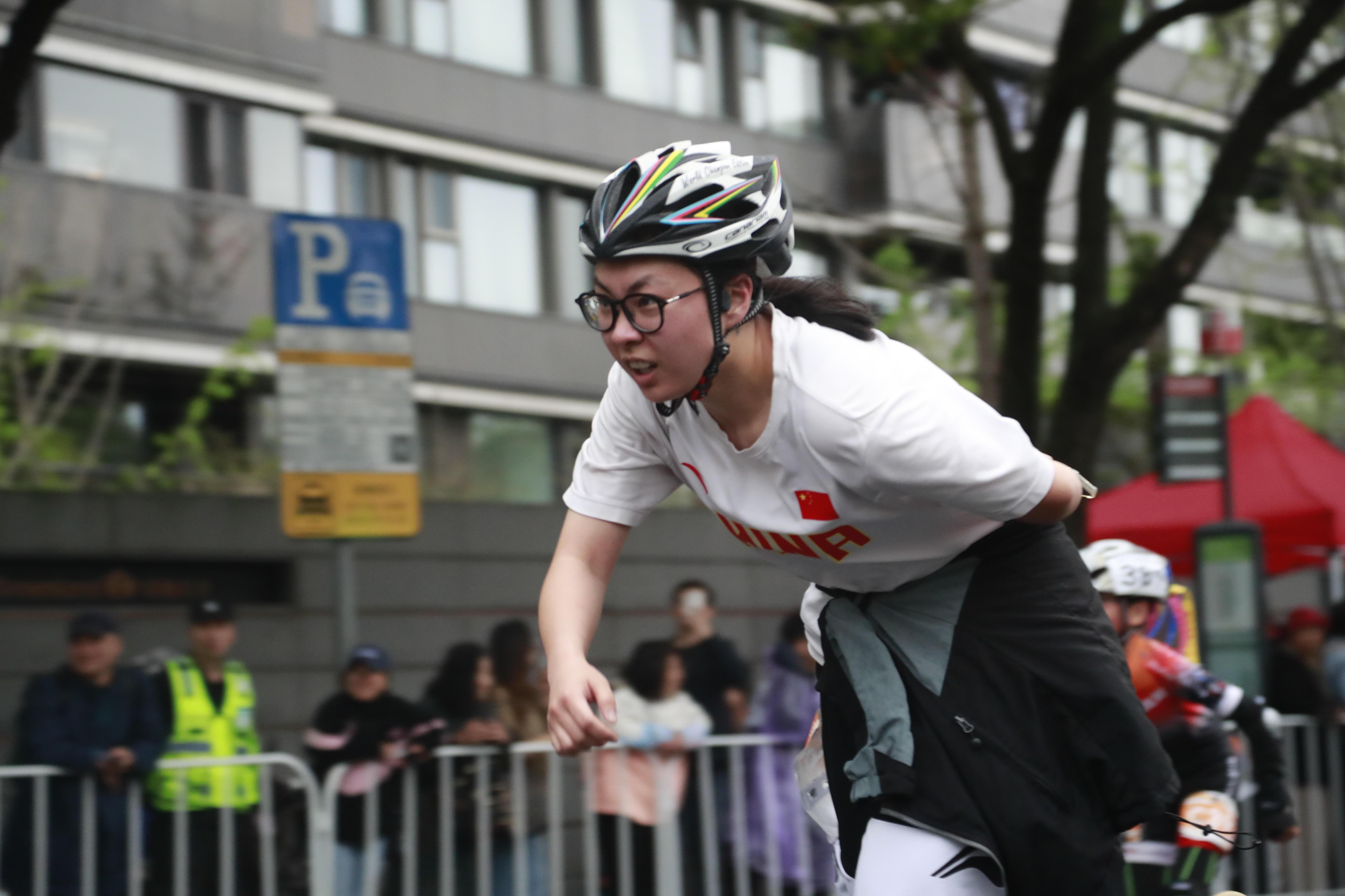 在世博会博物馆的轮滑四分马终点,不仅轮滑小选手争先恐后,大龄参赛选手也不甘落后。