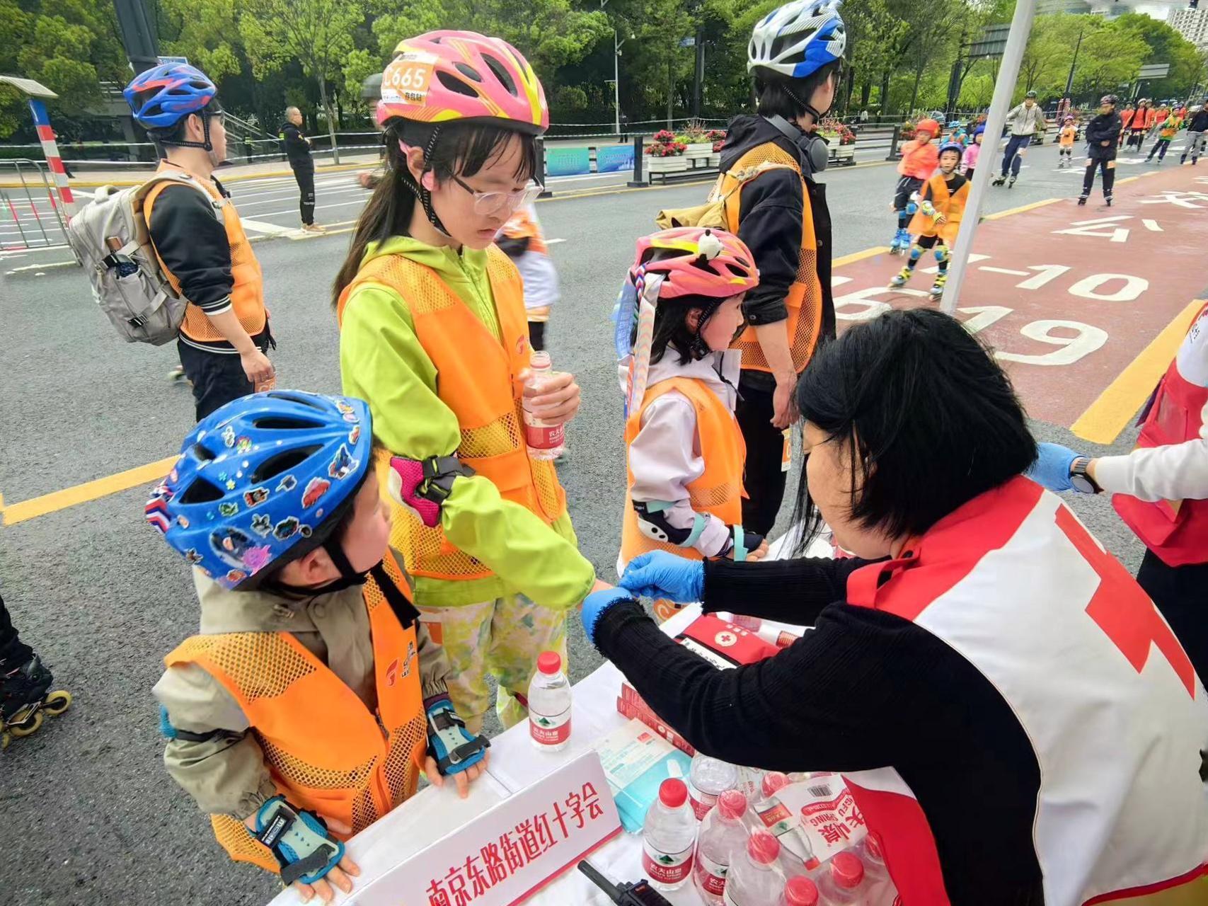 黄浦卫校作为黄浦区红十字基地,派驻了5位老师与街道红十字救护队一起分布在黄浦区内的5个红十字会医疗站点, 老师们结合马拉松运动员常见急症和意外伤害的救护工作特点,针对本次赛事中的轮滑运动速度快容易出现的肌肉拉伤、摔伤等紧急问题的救治方案进行强化,提高赛事医疗保障应急能力。他们为低血糖的小朋友送上巧克力、为韧带拉伤的跑者喷上药剂……为出现各种紧急情况的参赛者进行急救处理,他们坚守在岗,为黄浦马拉松做着“幕后英雄”,让每一位参赛者跑得更安心、更放心。