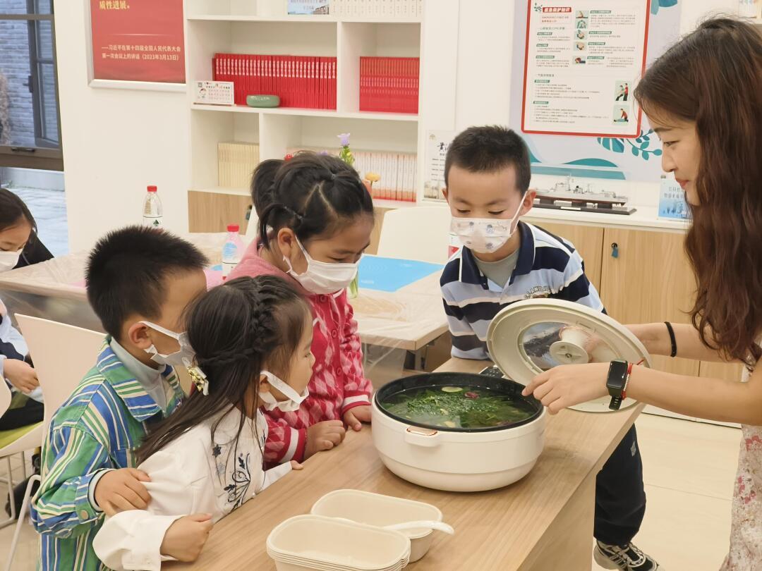 在桃花酥制作的过程中,工作人员还拿出提前精心挑选的新鲜荠菜和鸡蛋,搭配上营养丰富的红枣,在烹饪过程中,用勺子轻敲鸡蛋,为大家送上美味的上巳节特色食物——荠菜煮鸡蛋。“荠菜煮鸡蛋,不仅兼具荠菜和鸡蛋的营养,一起吃还有祛风除湿,排毒养颜,清肝明目的功效。”工作人员一边分发一边进行介绍,小朋友们接过鸡蛋,吃得津津有味,陪同的家长翘起大拇指说:“这种鸡蛋的做法以前没吃过,孩子很喜欢,以后自己也可以做。”