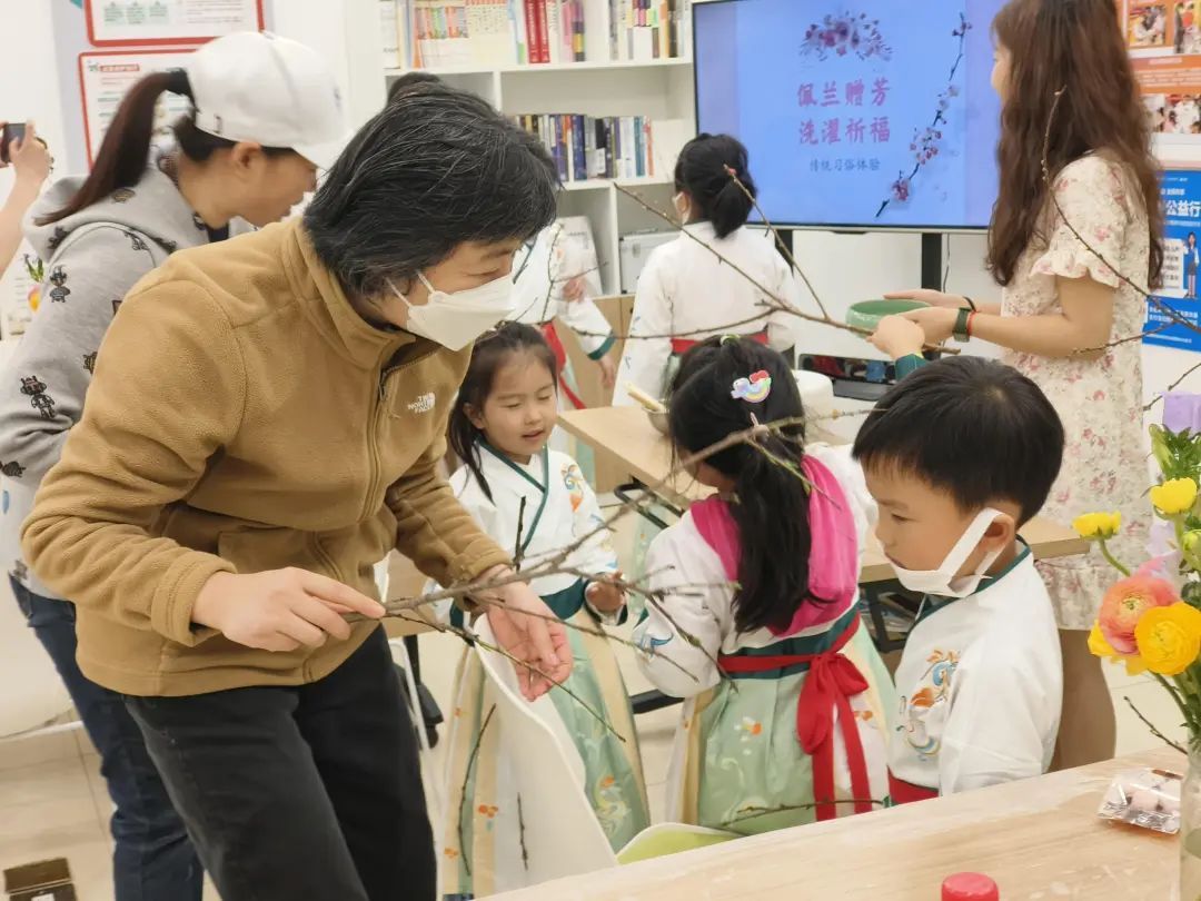 手持桃花枝进行祓禊仪式,对于很多亲子家庭来说都是第一次。作为上巳节重要的习俗之一,祓禊象征着清洁身心,祈求健康、平安。听了老师的讲解后,小朋友们手持沾水之后的桃花枝,认真为小伙伴们祈福。