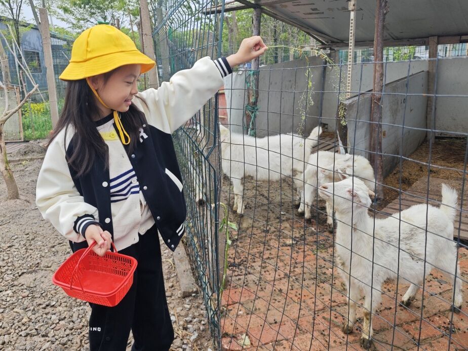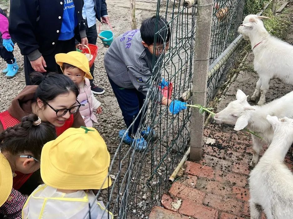 一旁羊舍里的小羊吸引了孩子们的目光,他们拿着青草来到小羊们的身边,轻轻地将食物喂给小羊们。看着它们吃得津津有味,孩子们感受到了与动物建立亲密关系的乐趣。