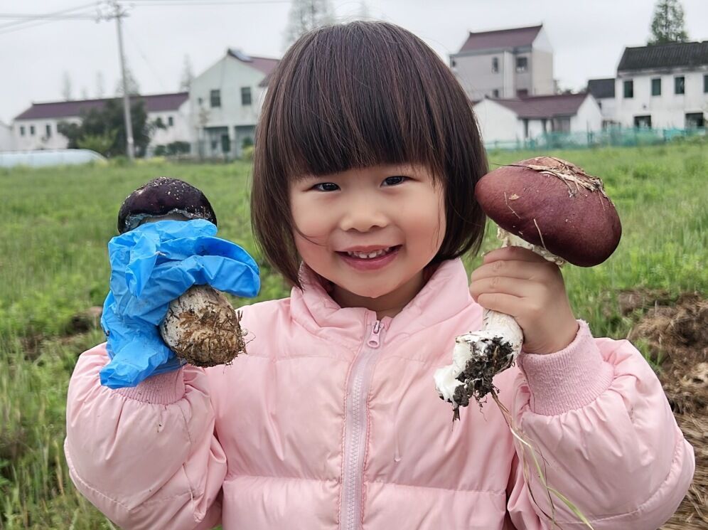 孩子们穿梭在田间地头,蹲下身子翻开稻草,大球盖菇就隐藏在厚厚的稻草堆下。孩子们仔细观察着每一个蘑菇,用他们的小手轻轻地将它们连根采摘下来,放进篮子里,不一会儿就收获了满满一篮的蘑菇。