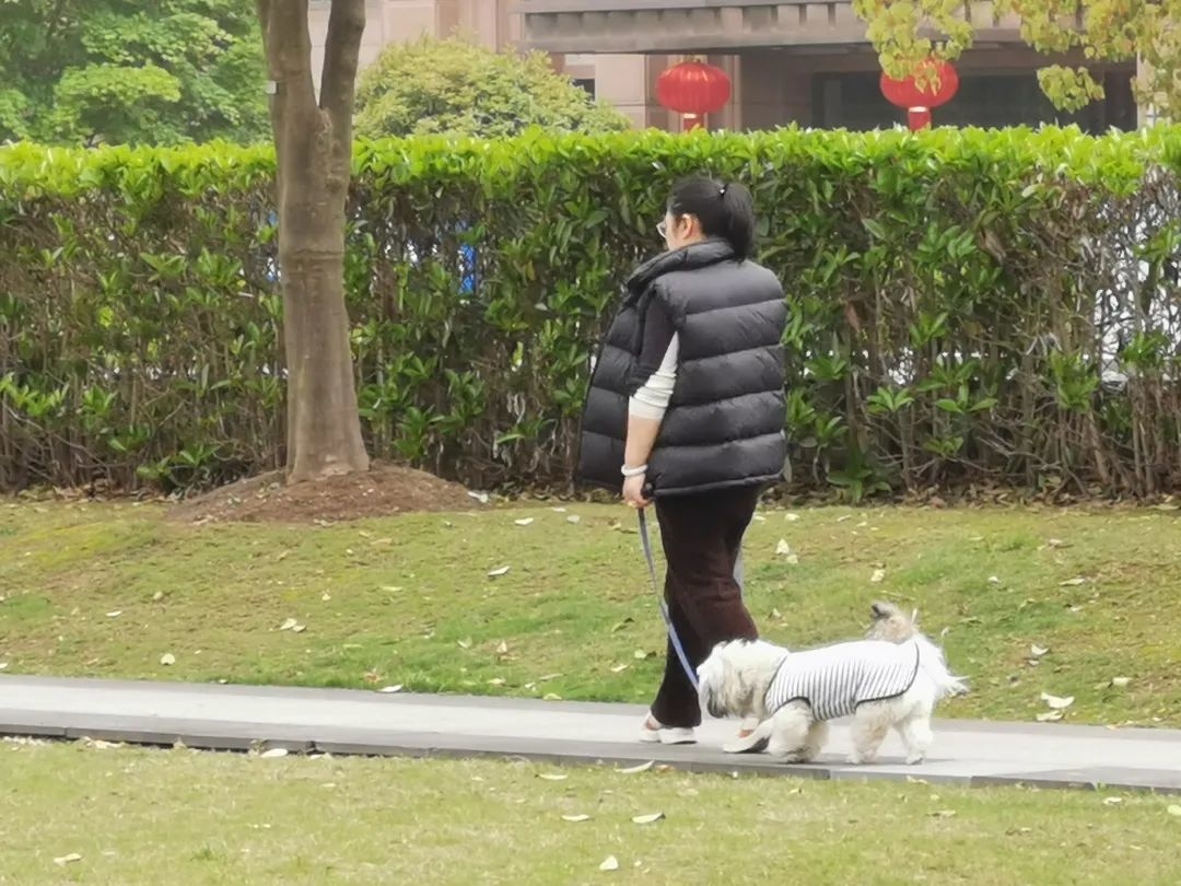 带着小狗出来遛遛,没想到今天天气这么热,穿得有点多,有点出汗。
