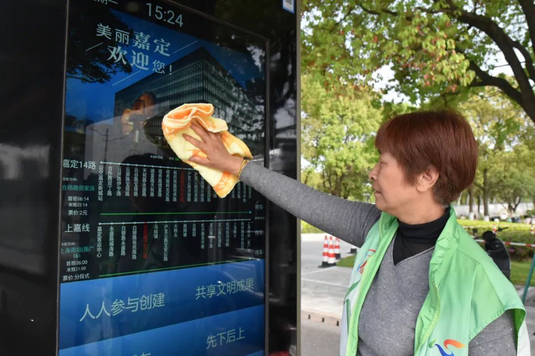 在一处公交车候车厅,众芳片区的志愿者们擦拭着候车座椅和站台显示屏。“把这些公共设施都擦得干干净净,让大家在赛事期间乘公交来逛逛远香湖,感受嘉定的城市会客厅。”志愿者陈阿姨说。