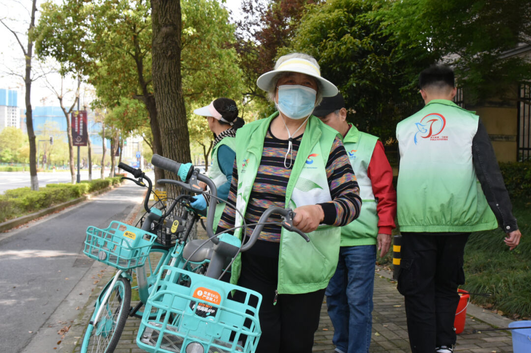 在上海国际赛车场外的伊宁路,安亭镇组织200名志愿者分为多支志愿者小队,清理小广告、死角垃圾,将路边非机动车排列整齐。