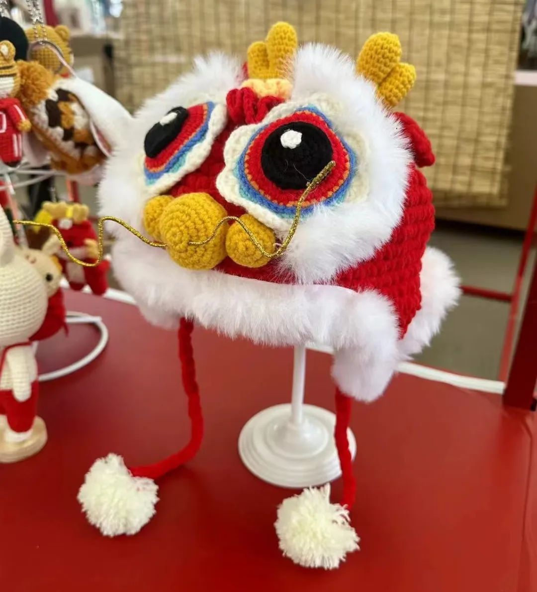 “今年是龙年,我们编织了一个颜色鲜艳的‘醒狮帽’。将金丝线烙在铁丝上,龙须就做好了,脸上一圈白毛条更是增加了龙的灵动感。”醒狮元素为华服增添了一份生动和活泼,华服的精美设计也为醒狮帽提供了更加广阔的搭配空间。