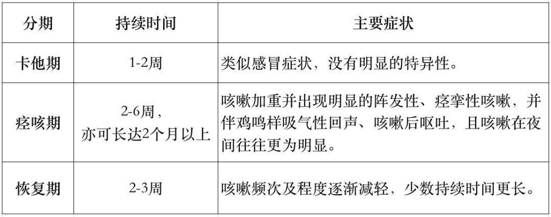 百日咳潜伏期一般为2-21天,平均7-10天。经过潜伏期后,典型百日咳一般经历三个阶段:卡他期、痉咳期和恢复期。