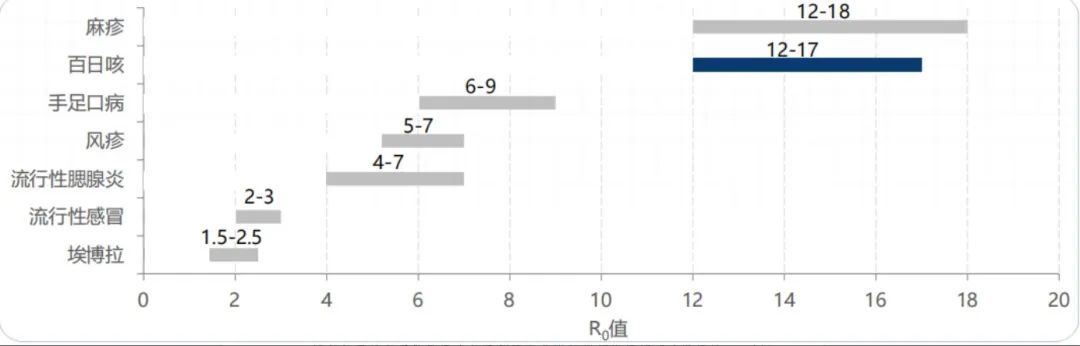 百日咳传染性很强,其基本再生数(R0)可达12-17,仅次于麻疹,显著高于流感。人是百日咳鲍特菌的唯一宿主,患者是主要传染源,主要通过呼吸道传播。
