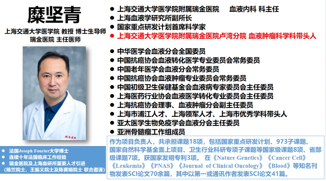 主要学术专长为急性淋巴细胞白血病、多发性骨髓瘤、淀粉样变性、M蛋白血症等淋巴系统和浆细胞疾病的精准诊断和靶向免疫化疗等综合治疗,并致力于相关基础和临床研究,负责并参与多项国家级课题,以第一作者于Leukemia、PNAS和Ebiomedicine等国内外杂志上发表多篇论文。多次获院级、市级和部级临床与科研成果奖,参编学术书籍十余部。