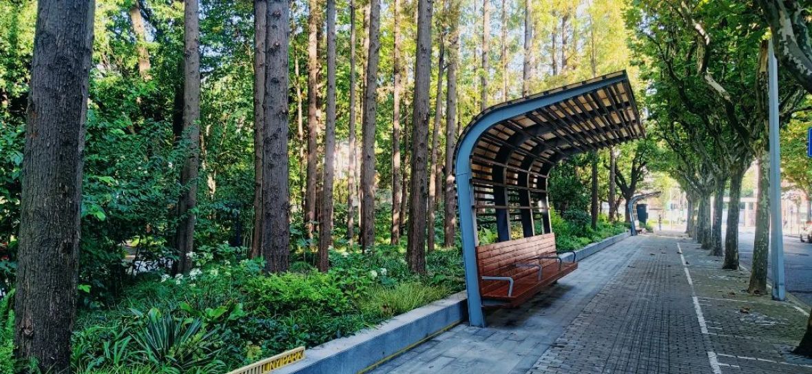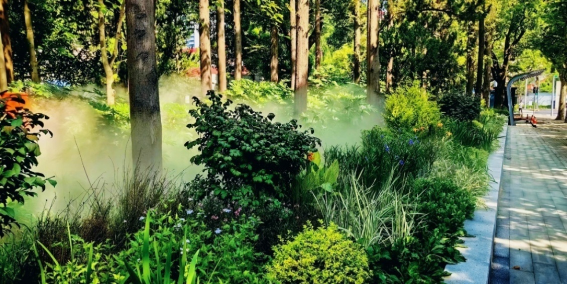 拆墙透绿前,临沂公园的围墙一定程度影响了社区公园绿色空间的可达性和共享性,且园内健身游乐场地老旧、功能单一。为了化有界为无界,让城市空间更均衡普惠,此次改造拆除了沂林路一侧约120米的围墙,根据现场,更新硬件设施,并对植物的配置进行了整体提升,新增红枫、无患子、金桂等乔木以及各类花境植物,还在原有的石板路段增添了雾森系统。阳光洒下,透过雾气,更是增添了几分“仙气”。