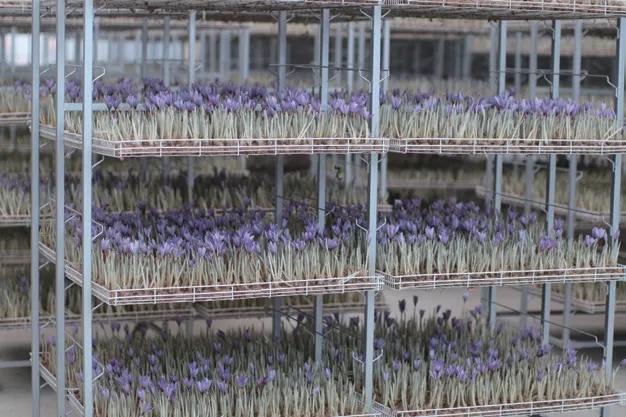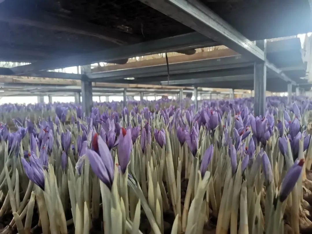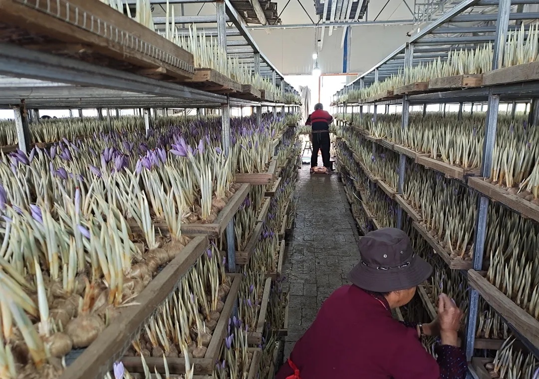 为了适应市场需求,万建达和村民们不断探索种植技术。他们借鉴伊朗的种植经验,同时结合本地实际情况,进行品种改良,采用“大田种球、室内育花”的方式(即每年4-5月,把藏红花种球从地里挖出,移到智能化育花大棚内进行培育,11月摘完花后再将其移到田里种植),确保藏红花在最佳的生长环境下成长。