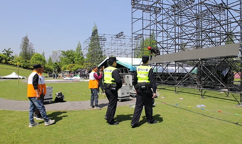 本周末, 第二届上海湾区·花开海上音乐节 将在金山花开海上生态园举行, 为保障音乐节安全有序进行, 金山警方提前做好 服务保障、隐患排查、交通出行等 重点领域工作, 营造舒心满意的文旅环境, 提升游客的满意度。 上午,朱泾派出所民警会同“花海义警”护游队在园区里进行巡逻时,发现工人将材料堆放到道路中间,影响交通出行,随即上前处置疏导。 而在音乐节主舞台区,工作人员正在紧锣密鼓地搭建舞台,调试设备,民警也在排查提醒注意防范各类安全隐患。 据了解,整个花开海上生态园区占地面积达1314亩,朱泾派出所探索推出“流动警务”联勤模式,充分调动社会资源,通过广泛发动景区保安、园区工作人员和志愿者成立“花海义警”护游队,将勤务模式从“驻点处警”向“巡逻处警”转变,极大缩短了处置时间。 朱泾派出所民警 徐佳翌 将园区的四大片区分成8个巡逻区域,高频次、高覆盖的进行巡逻。一旦园区内游客遇到问题,我们就能及时到群众身边,为其解决困难。 花开海上生态园共有2000个停车位,音乐节期间,通过周边资源开发,增设了200个临时停车位,并将根据实时情况引导游客泊车,以保障园区道路交通顺畅。 朱泾派出所民警 徐佳翌 金山交警支队和导航软件开展合作,一旦园区内出现拥堵情况我们就可以发出交通指引,将游客从园区引导到其他停车场停泊。 记者 | 朱林 冯秋萍 通讯员 | 沈浩 编辑 | 刘家园 责编 | 陈薇婷 潘婷