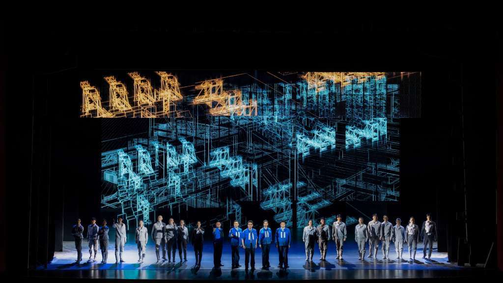 现代京剧《弄潮》坚持京剧的主体,以夸张、变形的程式动作为烘托表演、塑造人物、表达情感服务,达到“变其形而传其神”的艺术效果。团队以电脑操作无人码头软件排除障碍时的集体动作,电脑凭空“消失”,做出无实物的虚拟动作,延续了京剧的虚拟写意特性,而进行电脑测算数据、调试的图像通过多媒体技术呈现于舞台大屏,让技术感、智能感铺面而来,进一步渲染了舞台的“科技”氛围,将传统美学与现代工业质感结合,让观众眼前出现一个充盈着科技感的现代海港,既不脱离京剧虚拟写意的本质要求,又与剧目内容的气质相吻合,给观众带来了强烈的视觉冲击。