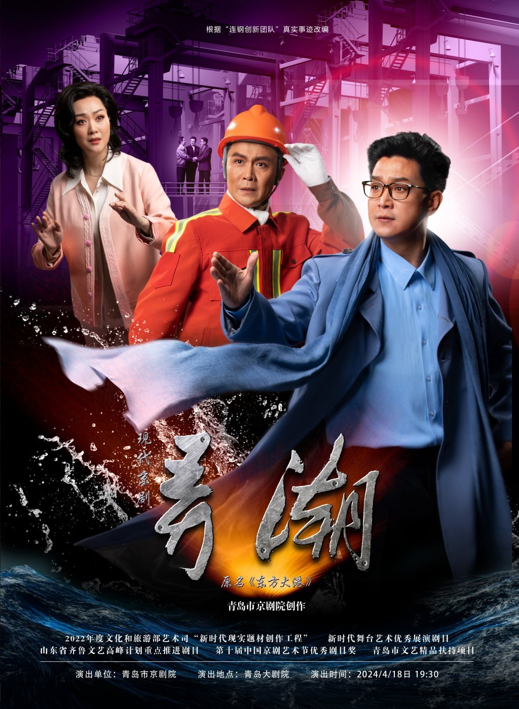 现代京剧《弄潮》原名《东方大港》,一年前《东方大港》就是从青岛出发,从这里起航,“开往”北京、日照、成都等地,时代楷模张连钢及其“连钢创新团队”的故事和精神深深感动了观众,弘扬了新时代工匠精神,以中华优秀传统文化讲好青岛故事,所到之处受到观众的喜爱和好评!时隔近一年,京剧《东方大港》焕新回归,正式更名《弄潮》再次在青岛大剧院上演!适逢张连钢荣获“感动中国2023年度人物”称号,现代京剧《弄潮》的上演也是为张连钢及其“连钢创新团队”献上一份舞台大礼,拉开本年度巡演的大幕!