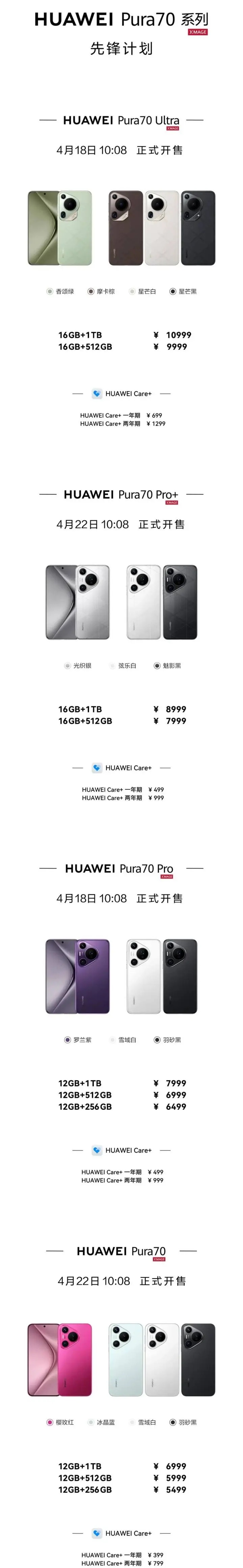 据华为公告,华为还有两款Pura 70 Pro+、华为Pura 70将在4月22日开售。