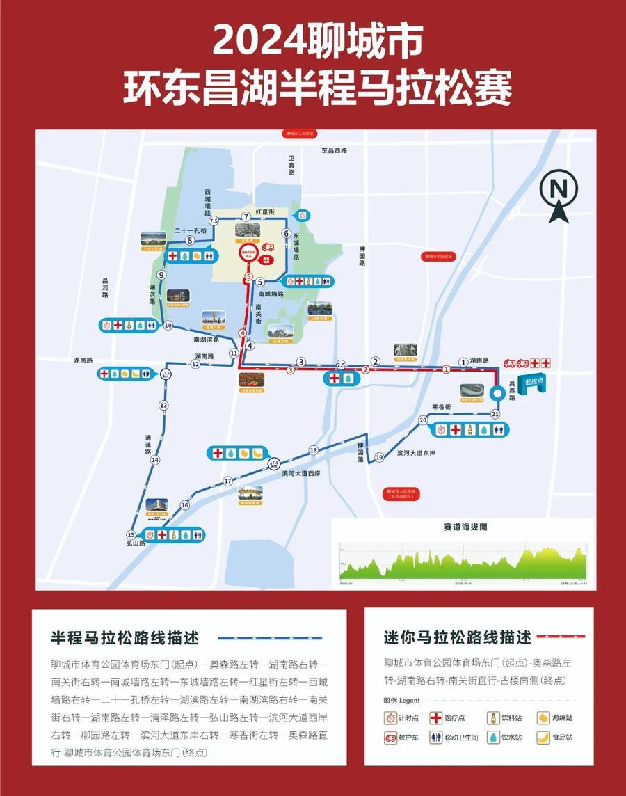 聊城市体育公园体育场东门(起点)→奥森路左转→湖南路右转→南关街右转→南城墙路左转→东城墙路左转→红星街左转→西城墙路右转→二十一孔桥左转→湖滨路左转→南湖滨路右转→南关街右转→湖南路左转→清泽路左转→弘山路左转→滨河大道西岸右转→柳园路左转→滨河大道东岸右转→寒香街左转→奥森路直行→聊城市体育公园体育场东门(终点)。迷你马拉松路线:聊城市体育公园体育场东门(起点)→奥森路左转→湖南路右转→南关街直行→古楼南侧(终点)。