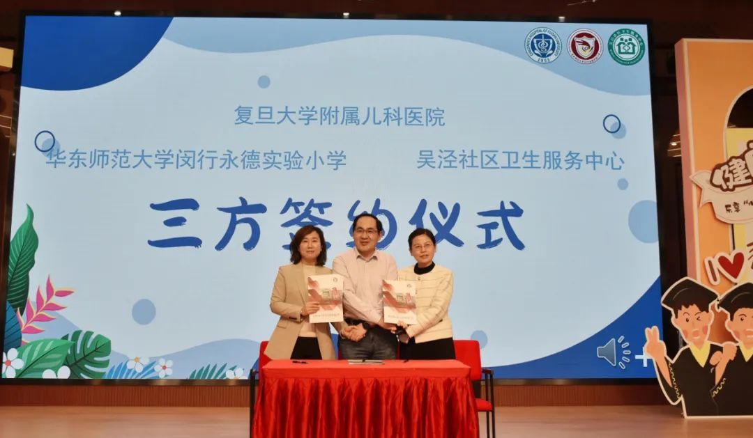 4月18日,“医校社联动,呵护儿童健康成长”主题活动在华东师范大学闵行永德实验小学举办。复旦大学附属儿科医院、华东师范大学闵行永德实验小学、吴泾社区卫生服务中心三方共同签署合作协议。 根据协议,三方将充分发挥儿科医院医疗资源、学校教学资源、社区卫生服务资源,通过健康科普创新、制度探索创新和合作机制创新,打造示范性医校社合作模式,有效推动儿童健康管理服务的能级提升,开启医校社联动新篇章。