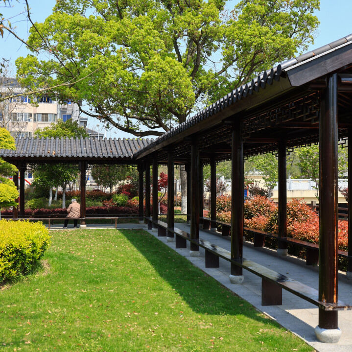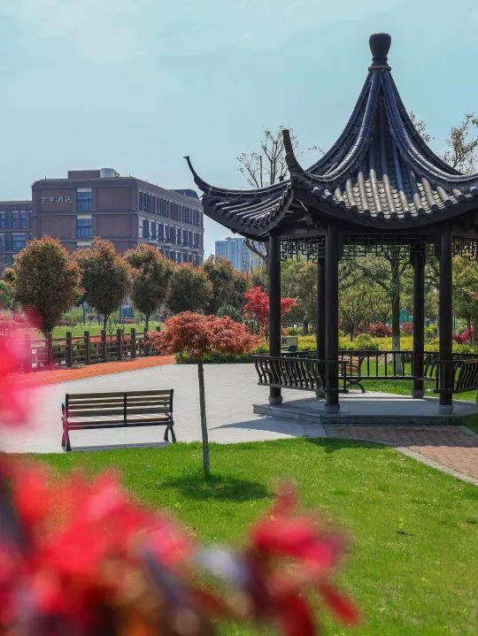 公园以植物造景为主,配置长廊、亭子、座椅等,整体风格为苏式园林风。快来享受绿树红花、凉亭美景。