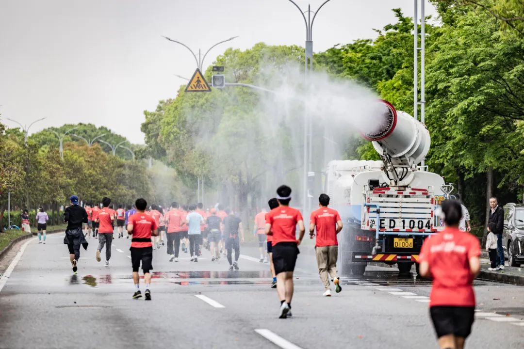现场设置3辆雾炮车,帮助选手物理降温,起终点及沿途安排7辆救护车、9个医疗急救点、35台AED,赛道救援人员、医疗志愿者、赛事服务志愿者等组成了专业的赛事保障服务团队,助力选手取得佳绩。