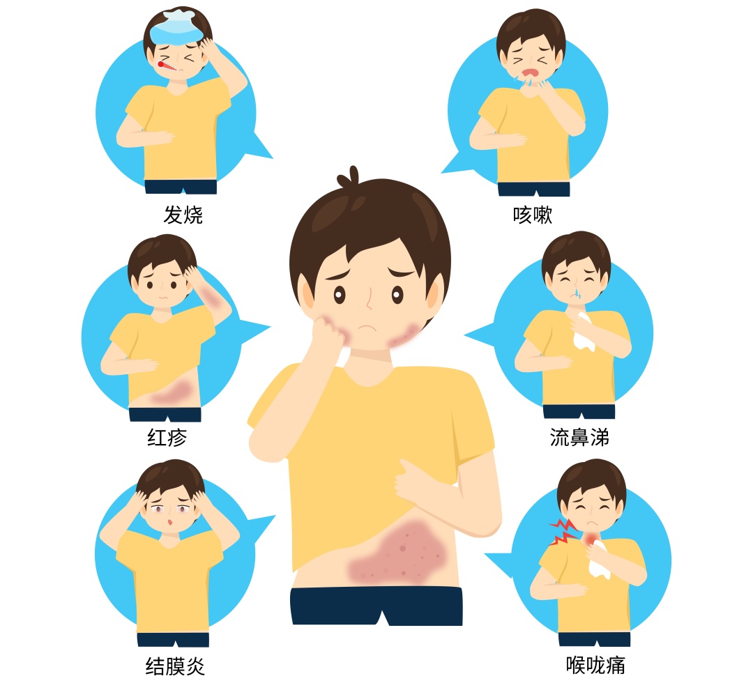 麻疹患者是唯一的传染源,急性期的患者是最重要的传染。经呼吸道飞沫传播是主要的传播途径,患者咳嗽、打喷嚏时,病毒随排出的飞沫经口咽、鼻部或眼结合膜侵入易感者。密切接触者亦可经污染病毒的手传播。