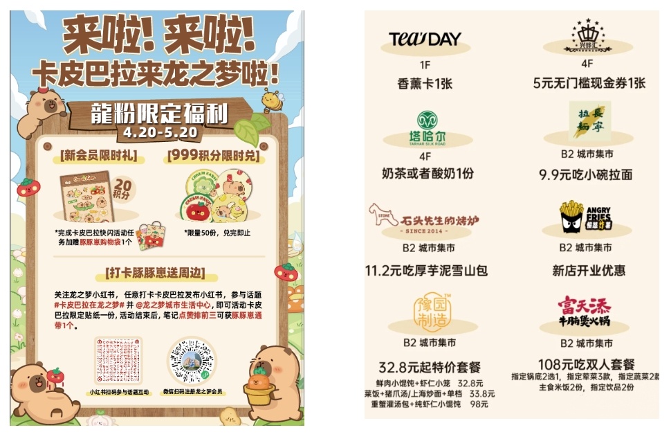 龙之梦联合场内部分餐饮商户推出了美食打卡活动,任意打卡指定餐饮品牌的卡皮巴拉拍照点,即可特价获得活动限定套餐一份。5月2日及5月5日,开心麻花将联动卡皮巴拉,带来别开生面的表演。