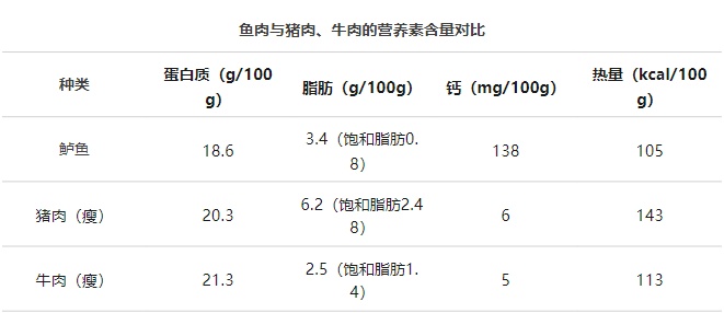 鱼肉作为“白肉”的一种,比起猪牛羊肉来说,热量和饱和脂肪的含量更低,钙等矿物质的含量相对更高,可以作为减重、减脂期的优质蛋白质来源。