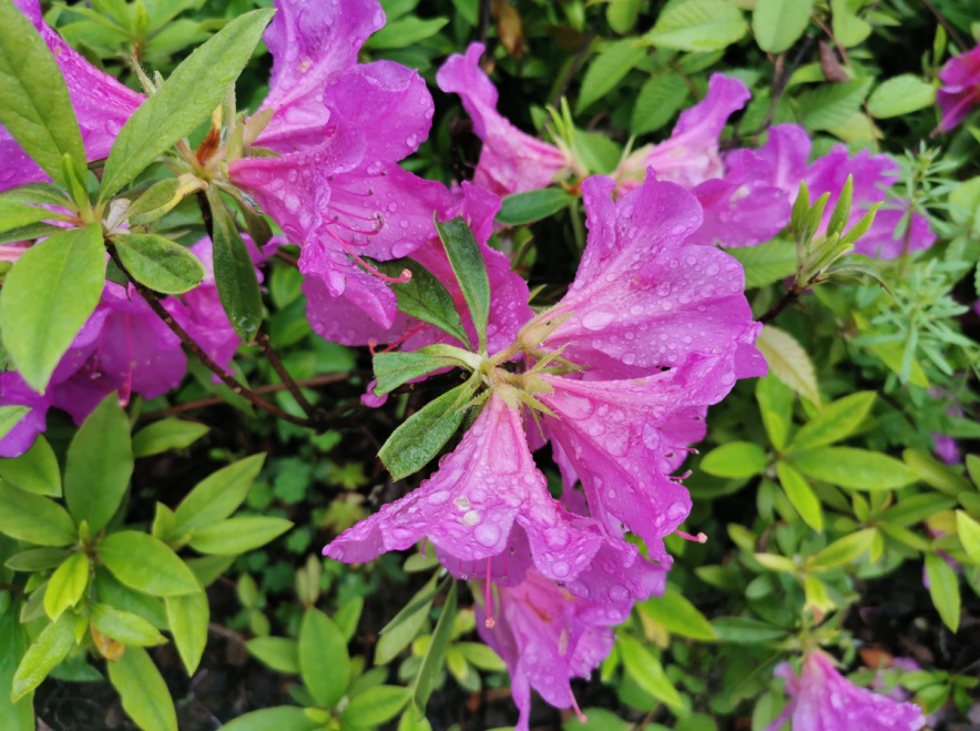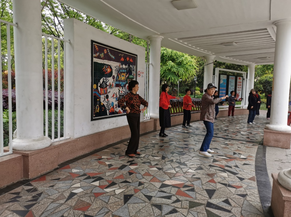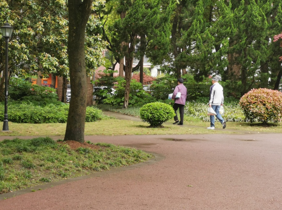 上午九点左右,天空阴沉,下着蒙蒙细雨,温度适宜,东礁公园里,各类花卉绿植茂盛生长,叶片上挂满晶莹的水珠,呈现出春天之美,有市民在长廊中锻炼、聊天,或撑着伞漫步雨中。临近中午,雨水渐止,天空变得明亮,公园也再度热闹起来。